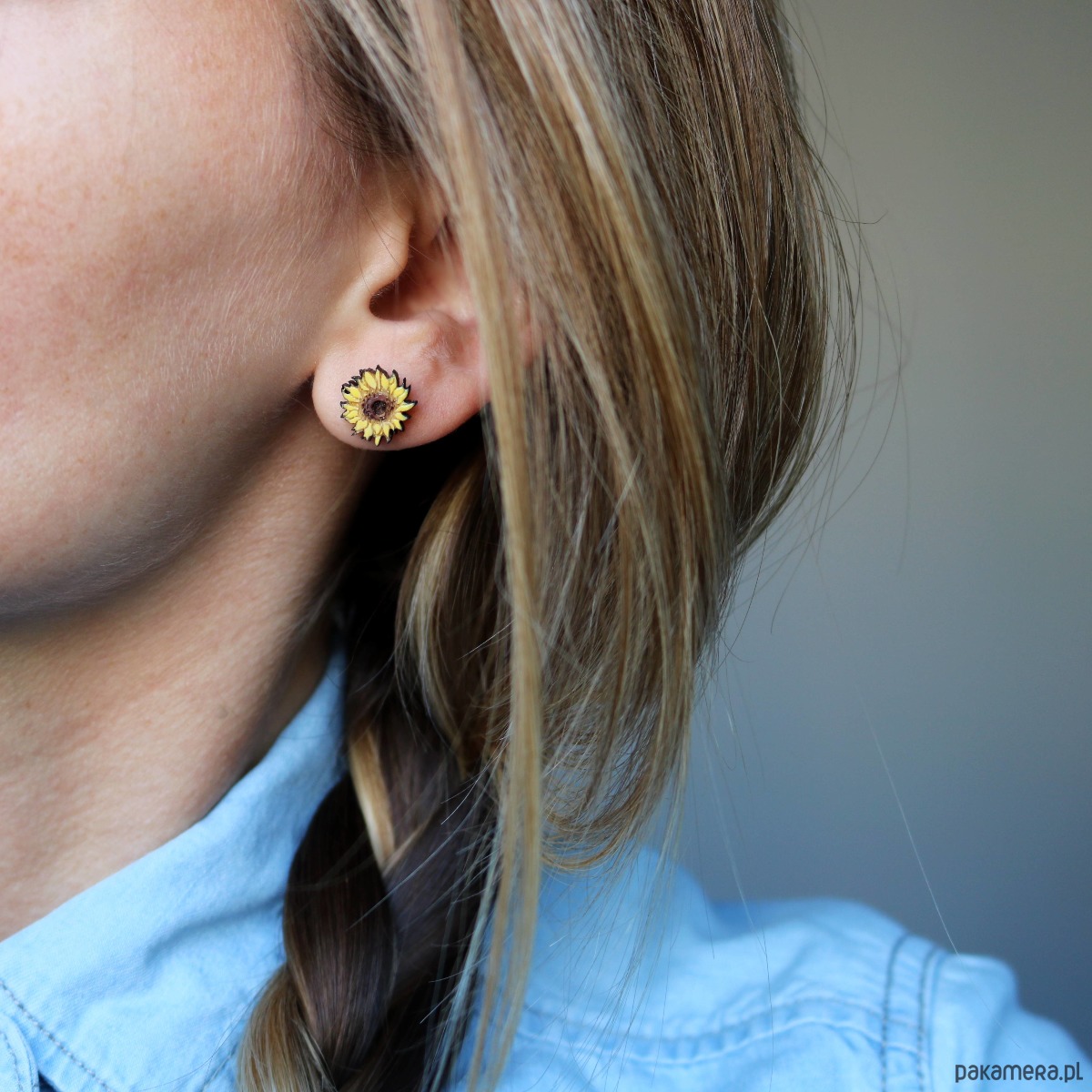 Przedstawiam drewniane kolczyki w kształcie kwiatów słonecznika.