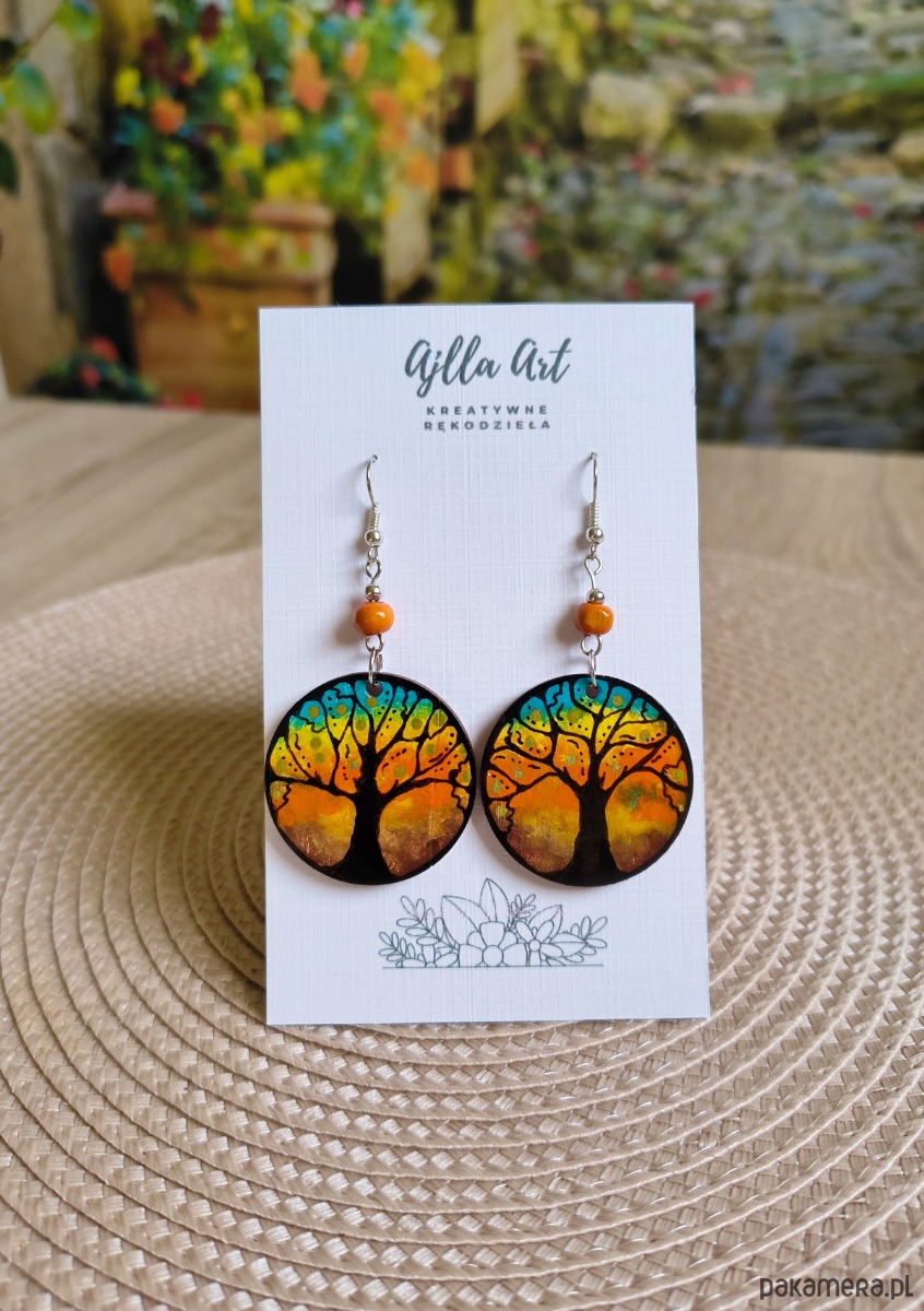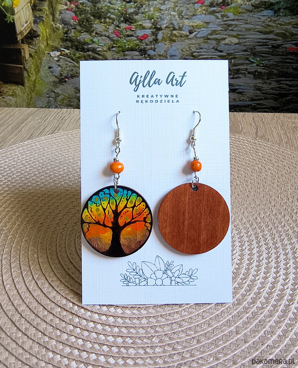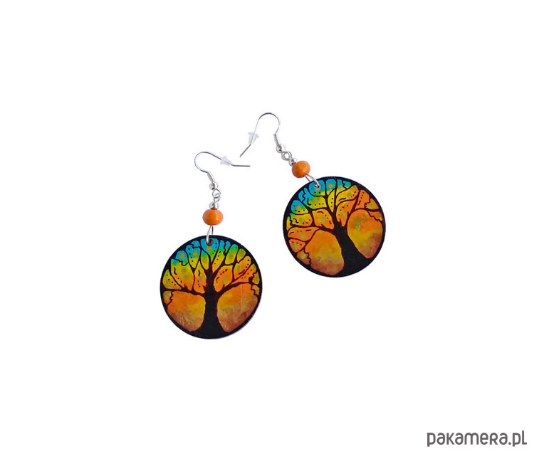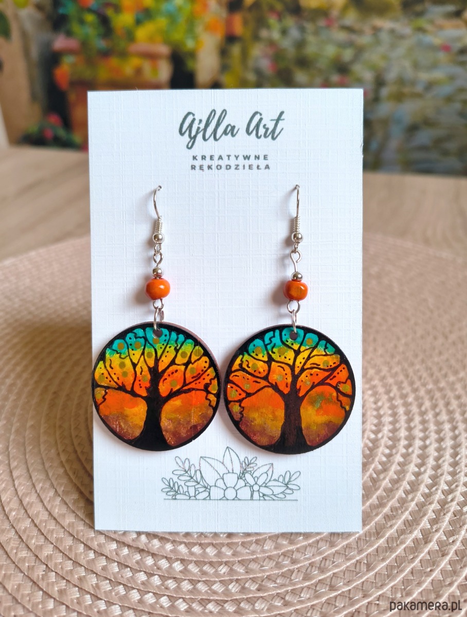 Lekkie kolczyki drewniane ręcznie malowane farbami akrylowymi z motywem drzewa.