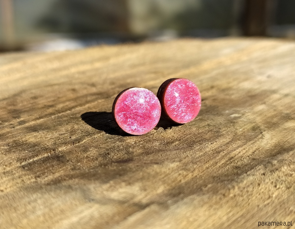 Ekologiczne, oryginale kolczyki - sztyfty wykonane z drewna brzozowego (sklejka), ręcznie pokrytego malinowo różową perłową żywicą epoksydową.
