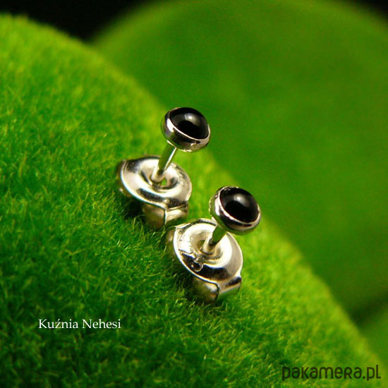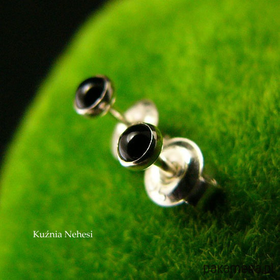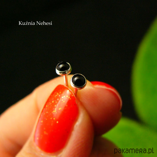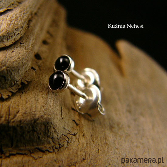 Delikatne niewielkie kolczyki sztyfty wykonane ręcznie ze srebra próby 925 oraz przepięknych czarnych Onyksów. Kamienie klasy AAA. Kolczyki mają średnicę 3,5 milimetra. Mogę wykonać pierścień do kompletu. Nehesi