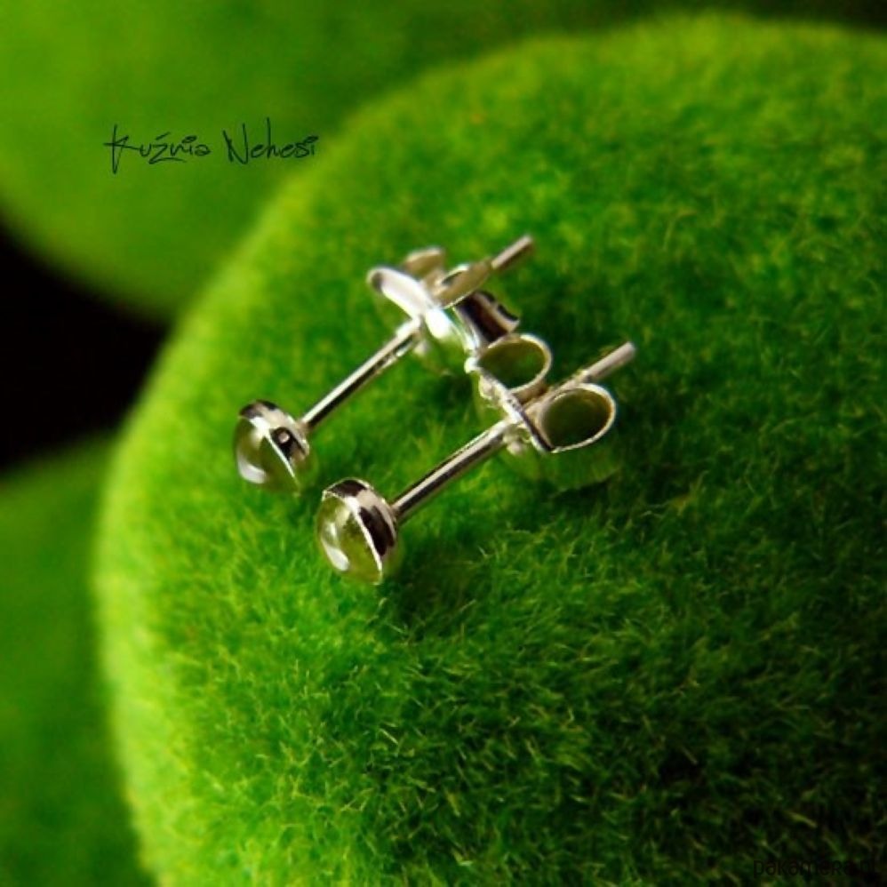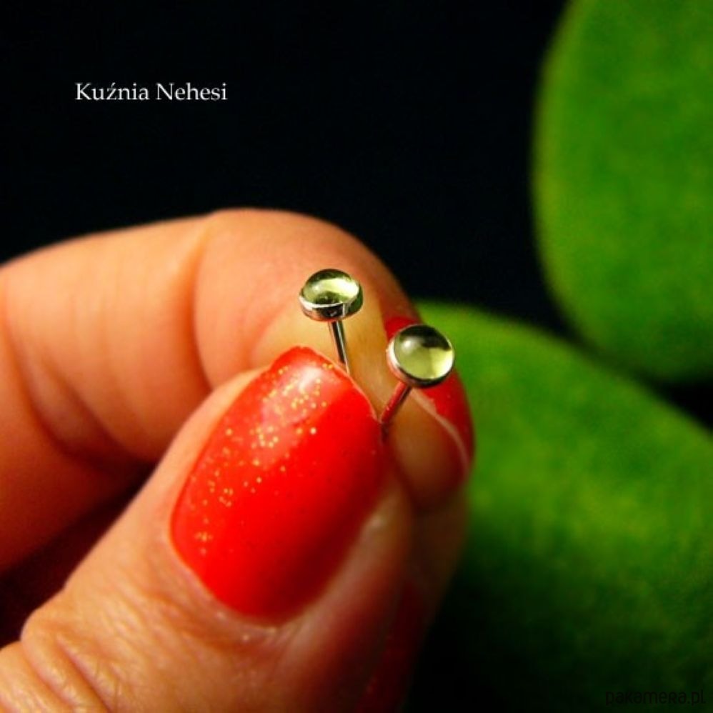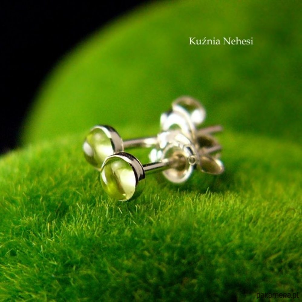 Delikatne niewielkie kolczyki sztyfty wykonane ręcznie ze srebra próby 925 oraz przepięknych zielonych Oliwinów. Kolczyki mają średnicę 3,5 milimetra. Polecam pierścień do kompletu.