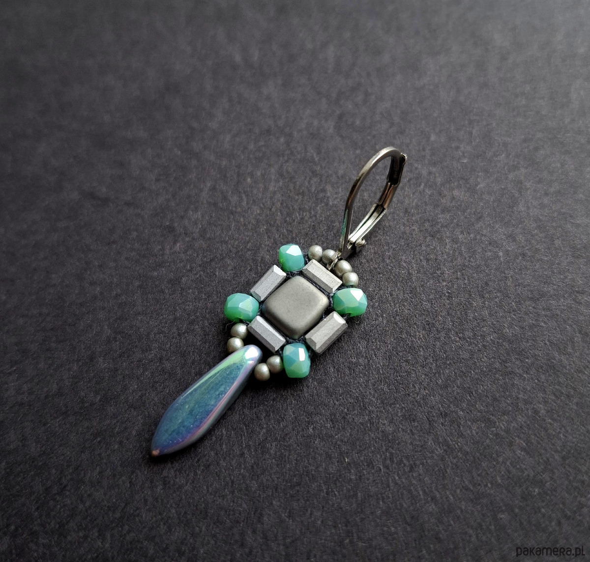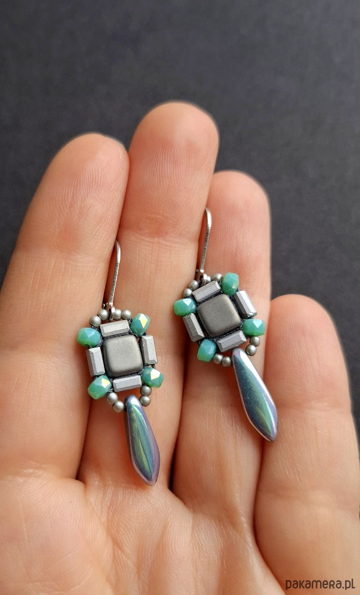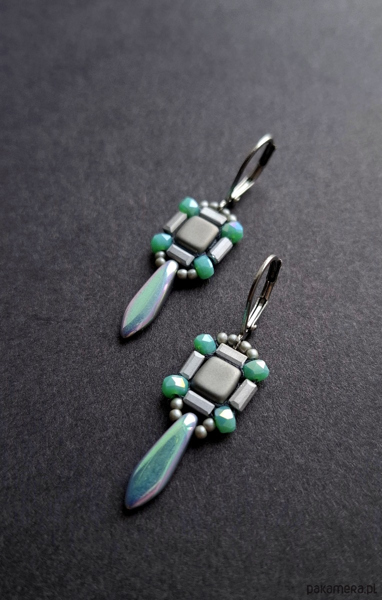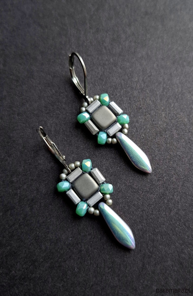 Kolczyki wiszące wykonane techniką swoistego haftu drobnymi, szklanymi koralikami. Dwustronne, podwieszone na posrebrzanych, nieuczulających biglach typu angielskiego. Wymiary: długość wraz z zapięciem - 4,5 cm, szerokość max. 1,3 cm.