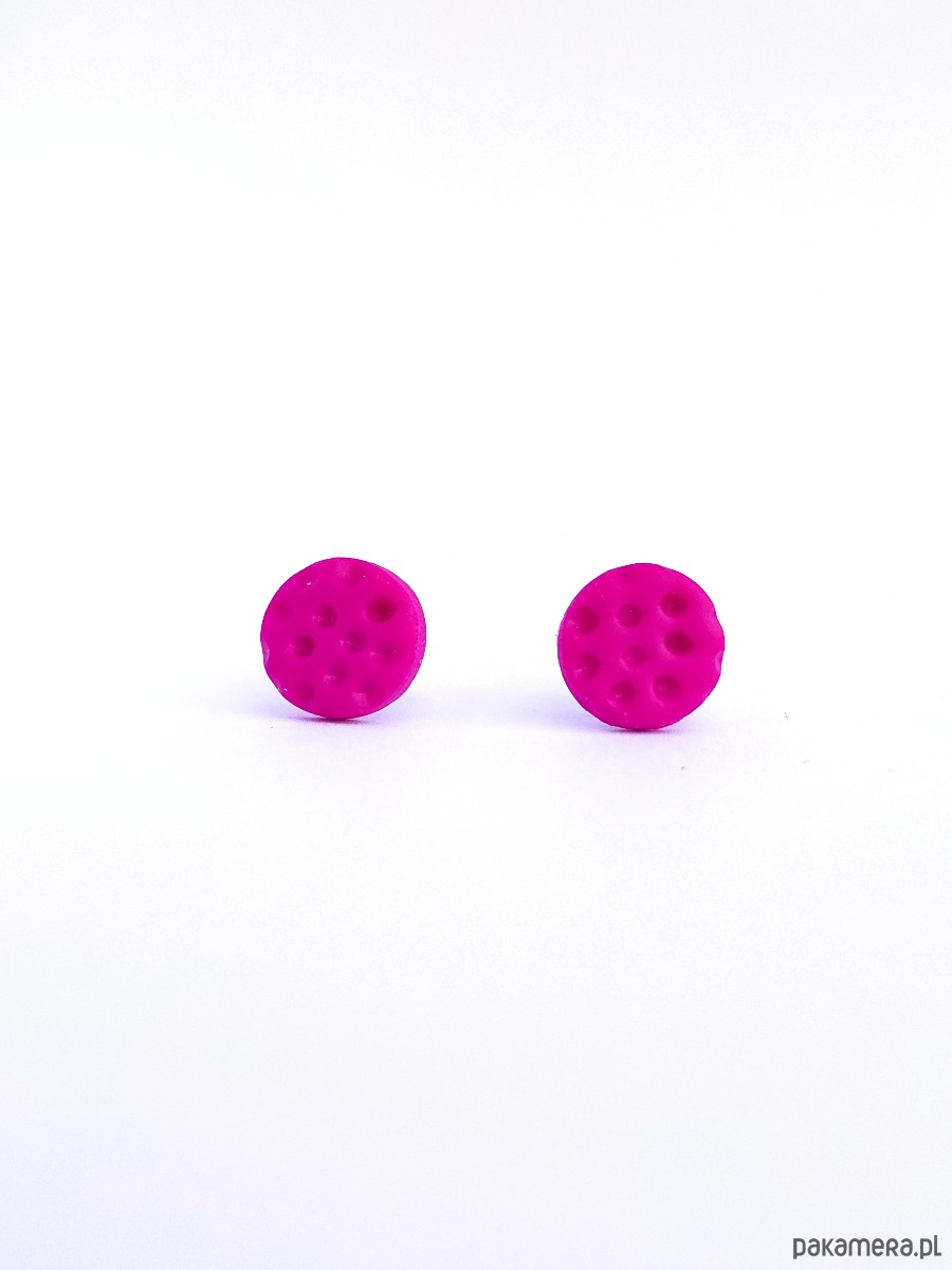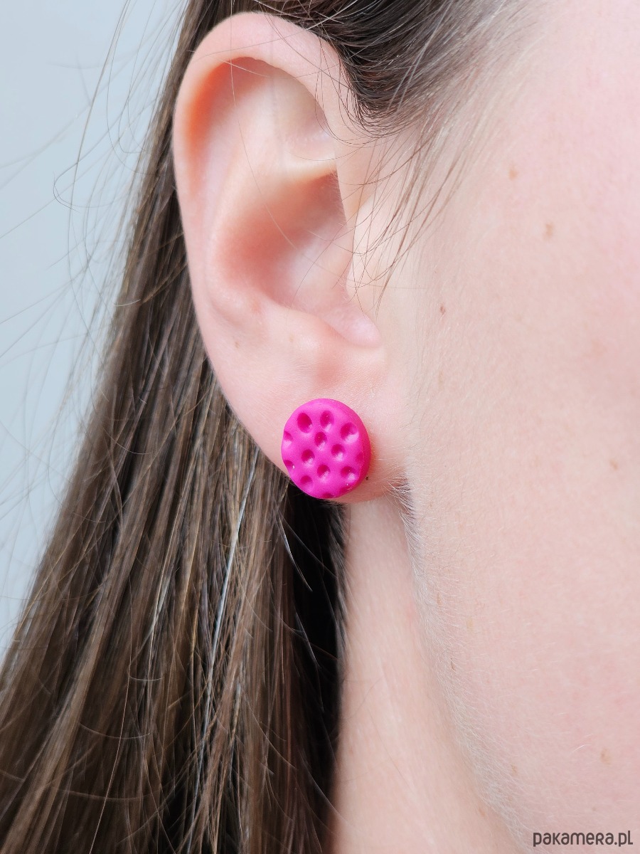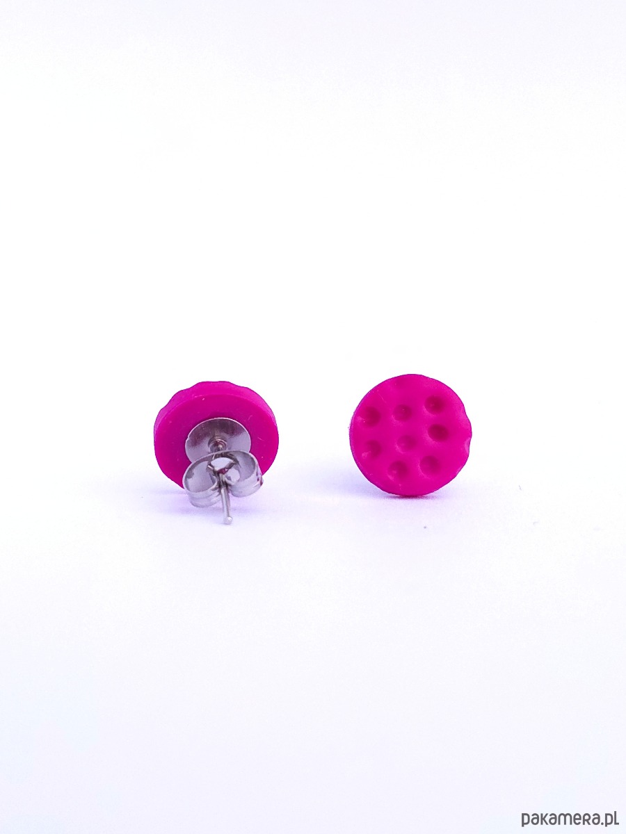 Leciutkie kolczyki z glinki polimerowej, sztyfty i zatyczki ze stali chirurgicznej.