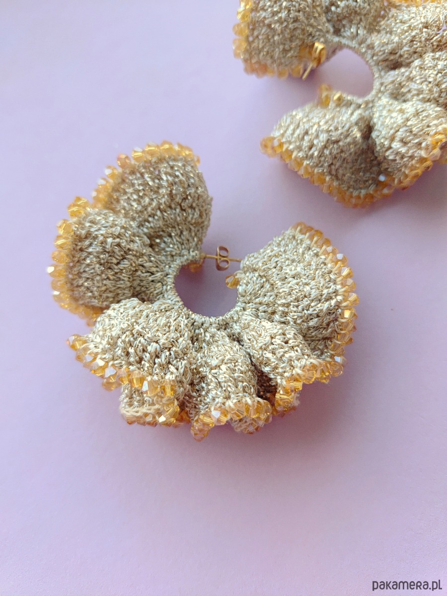 Zostały wykonane ręcznie na szydełku z cienkich nici w kolorze złota, z dodatkiem szklanych koralików, które delikatnie odbijają światło.