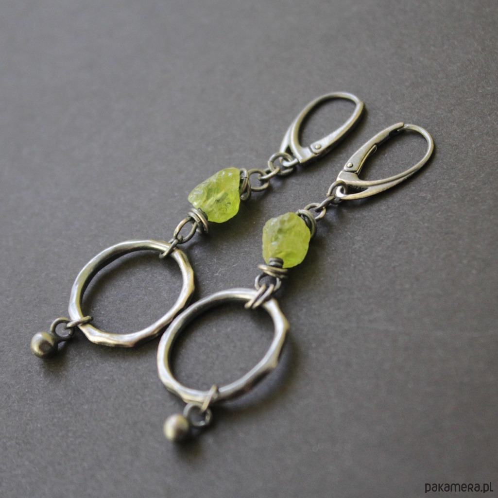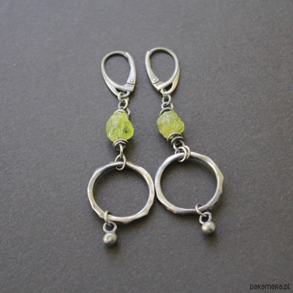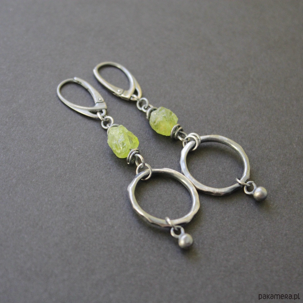 Oryginalne kolczyki wykonane zostały z oksydowanego srebra próby 925 oraz surowych bryłek oliwinów wielkości 0,7 cm.