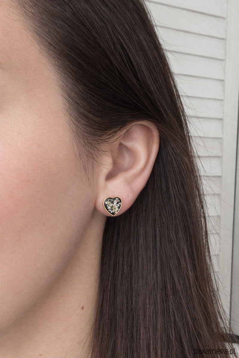 Ręcznie wykonane kolczyki z zawieszkami w kształcie serca . Biżuteria wykonana jest z wyselekcjonowanych płatków kwiatów dzikiej marchwi, na czarnym tle. Kolczyki pięknie prezentują się na uchu, są efektowne i wyjątkowo lekkie co stanowi komfort noszenia.