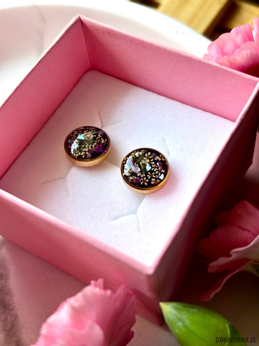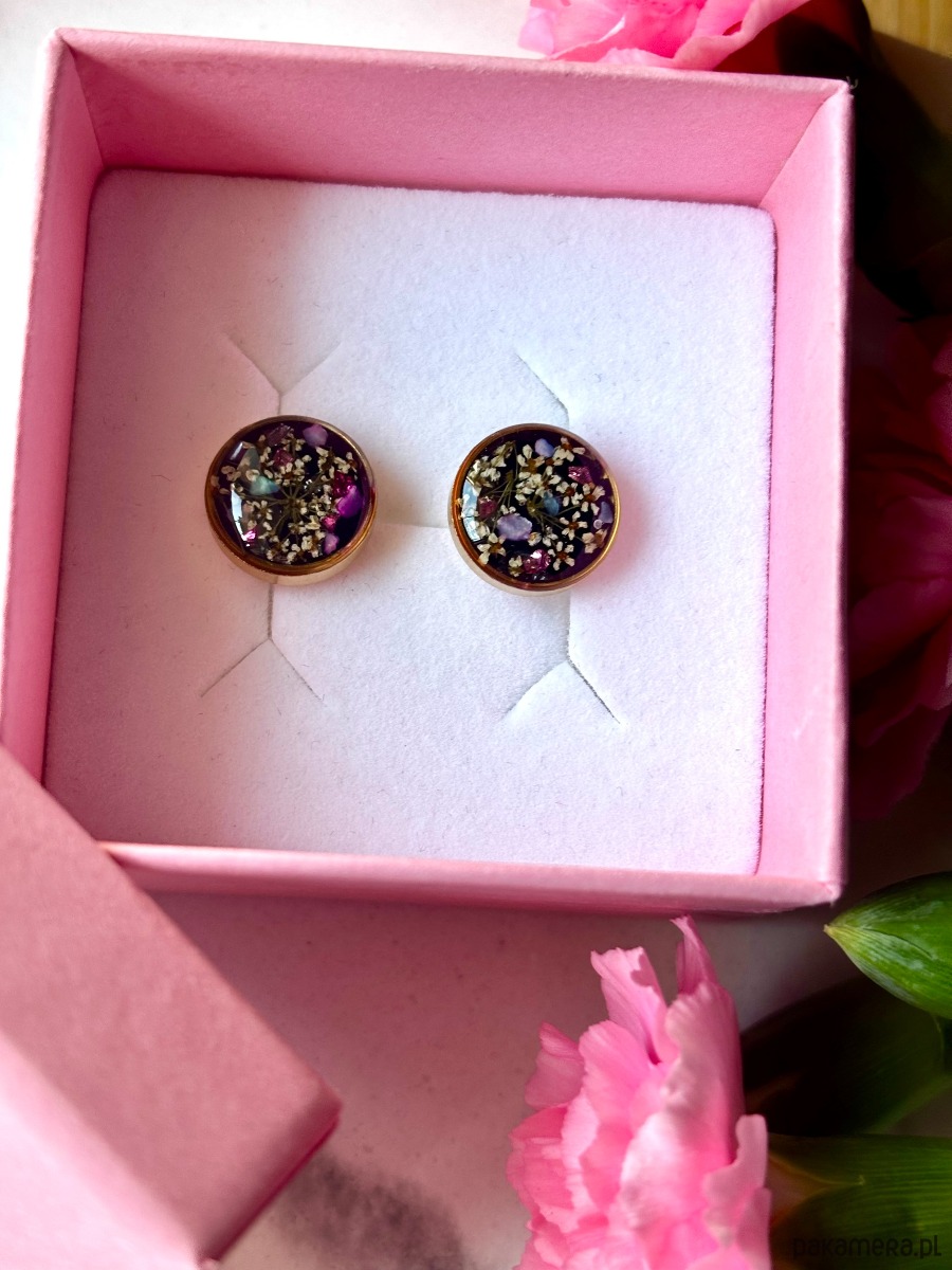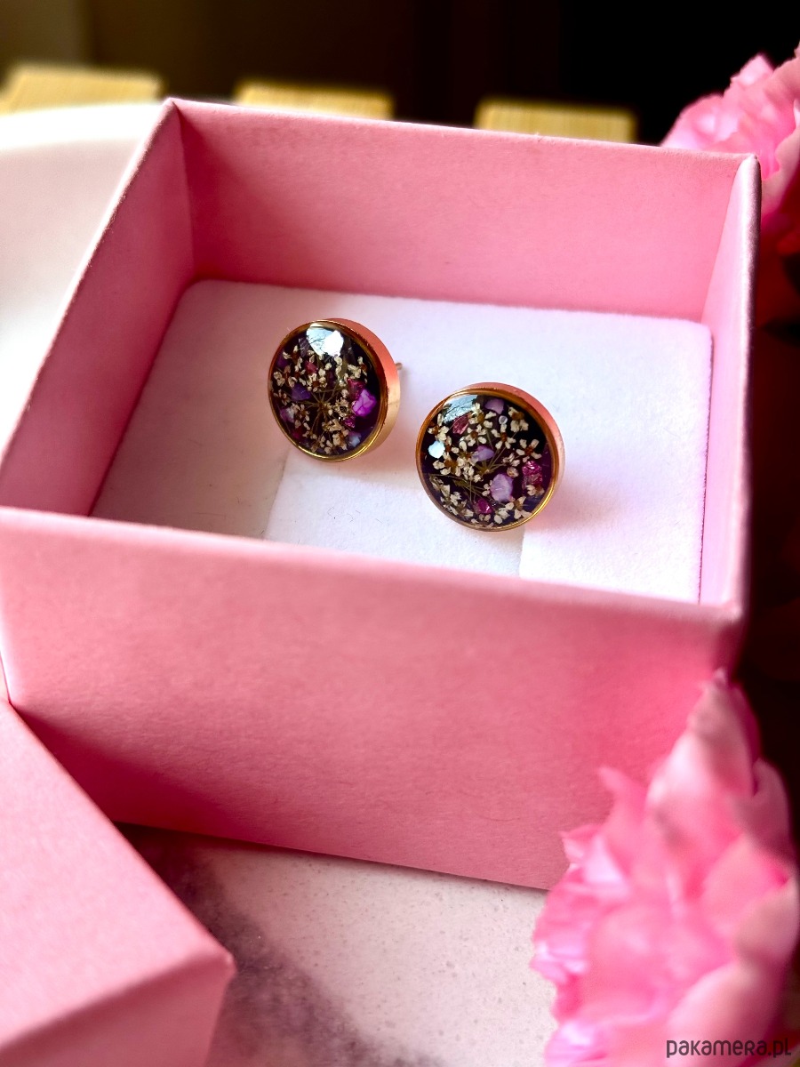 Ręcznie wykonane kolczyki z okrągłymi zawieszkami . Biżuteria wykonana jest z wyselekcjonowanych płatków kwiatów dzikiej marchwi, na tle z czarnego szkła. Kolczyki dodatkowo ozdobione są kawałkami szkła i masy perłowej w odcieniach różu. Kolczyki pięknie prezentują się na uchu, są efektowne i wyjątkowo lekkie co stanowi komfort noszenia.