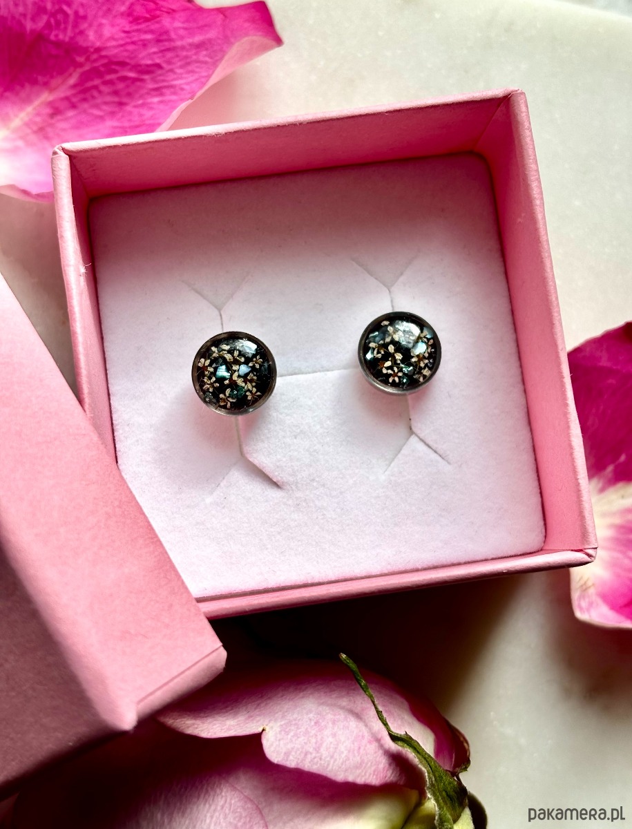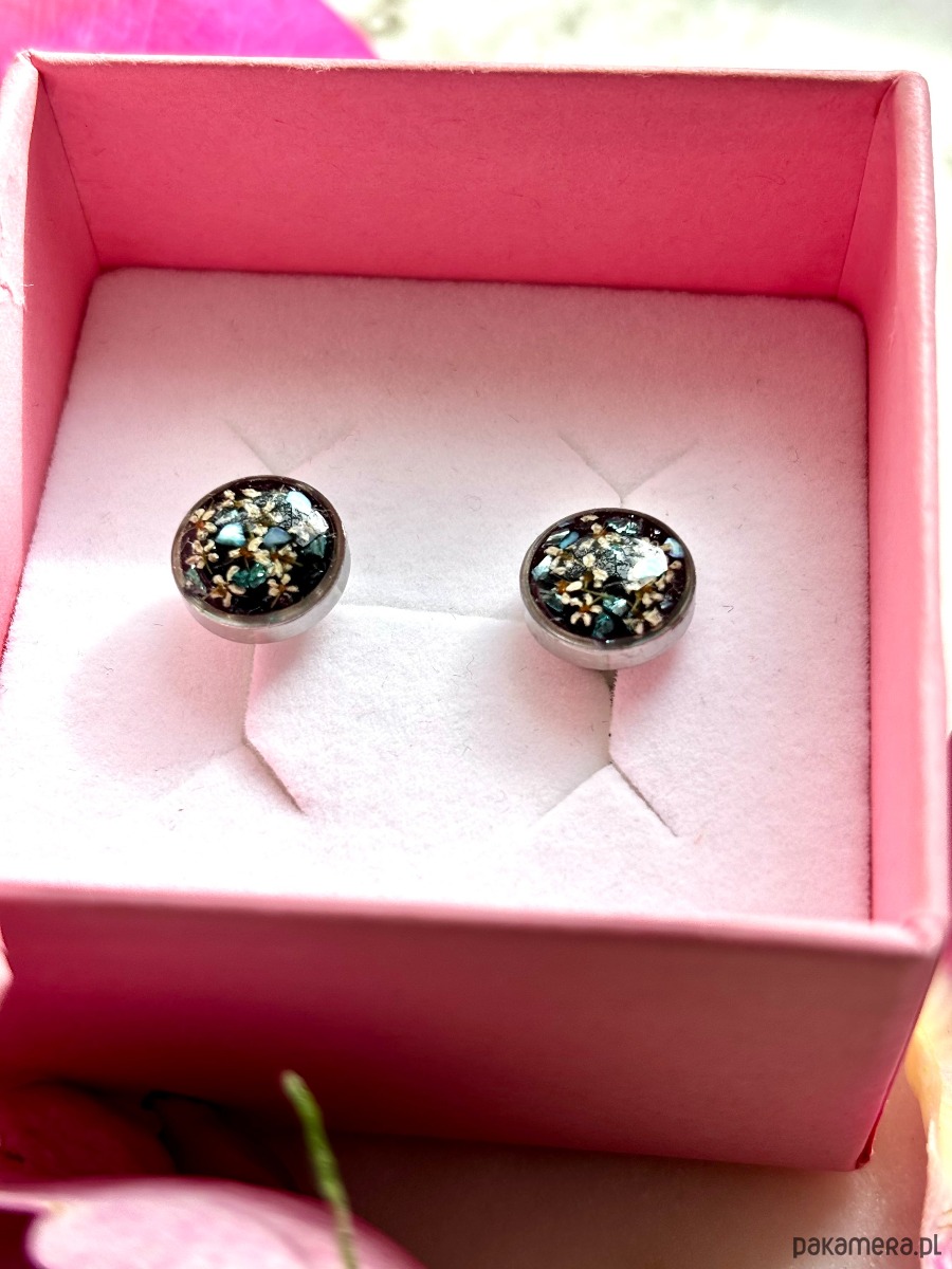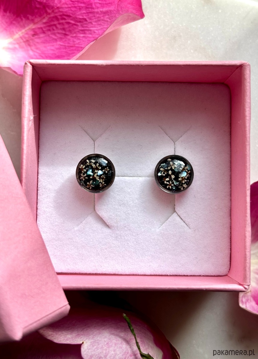 Ręcznie wykonane kolczyki z okrągłymi zawieszkami . Biżuteria wykonana jest z wyselekcjonowanych płatków kwiatów dzikiej marchwi, na tle z czarnego szkła. Kolczyki dodatkowo ozdobione są kawałkami szkła i masy perłowej w odcieniach niebieskim i zielonym. Kolczyki pięknie prezentują się na uchu, są efektowne i wyjątkowo lekkie co stanowi komfort noszenia.