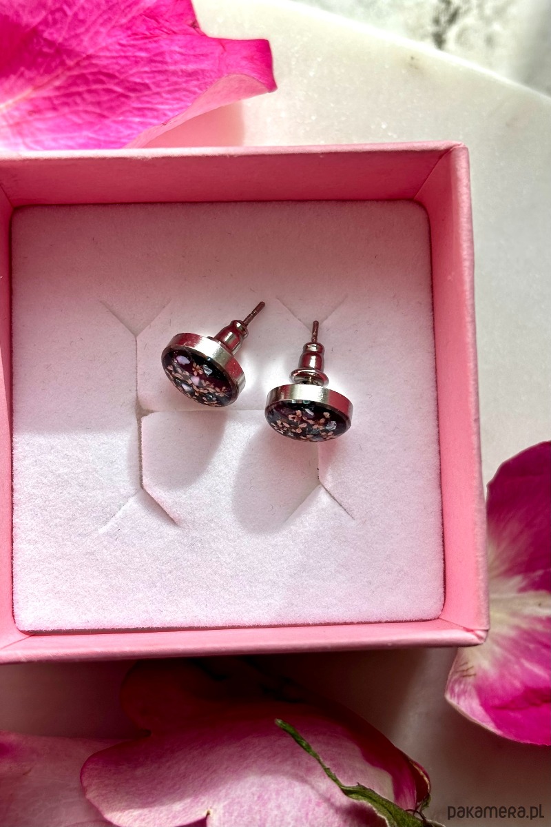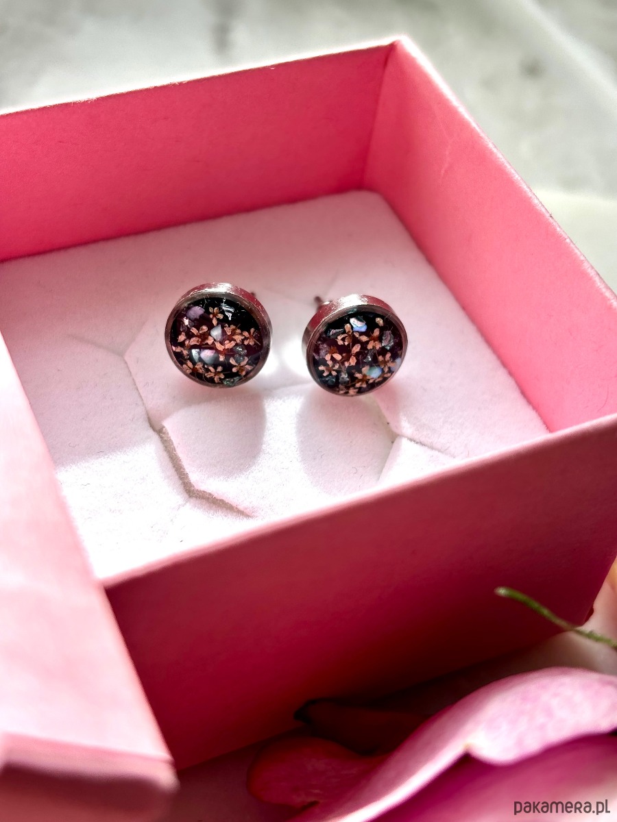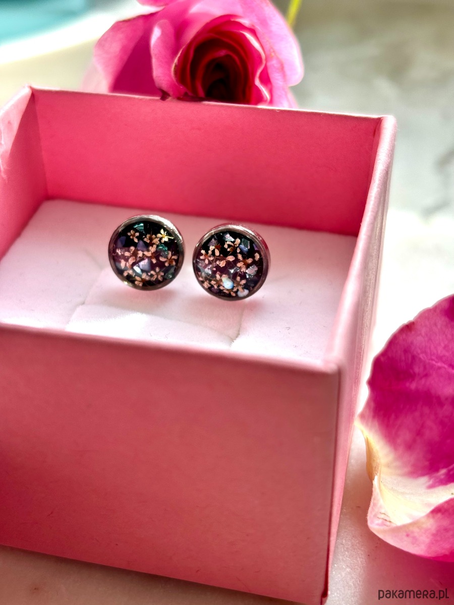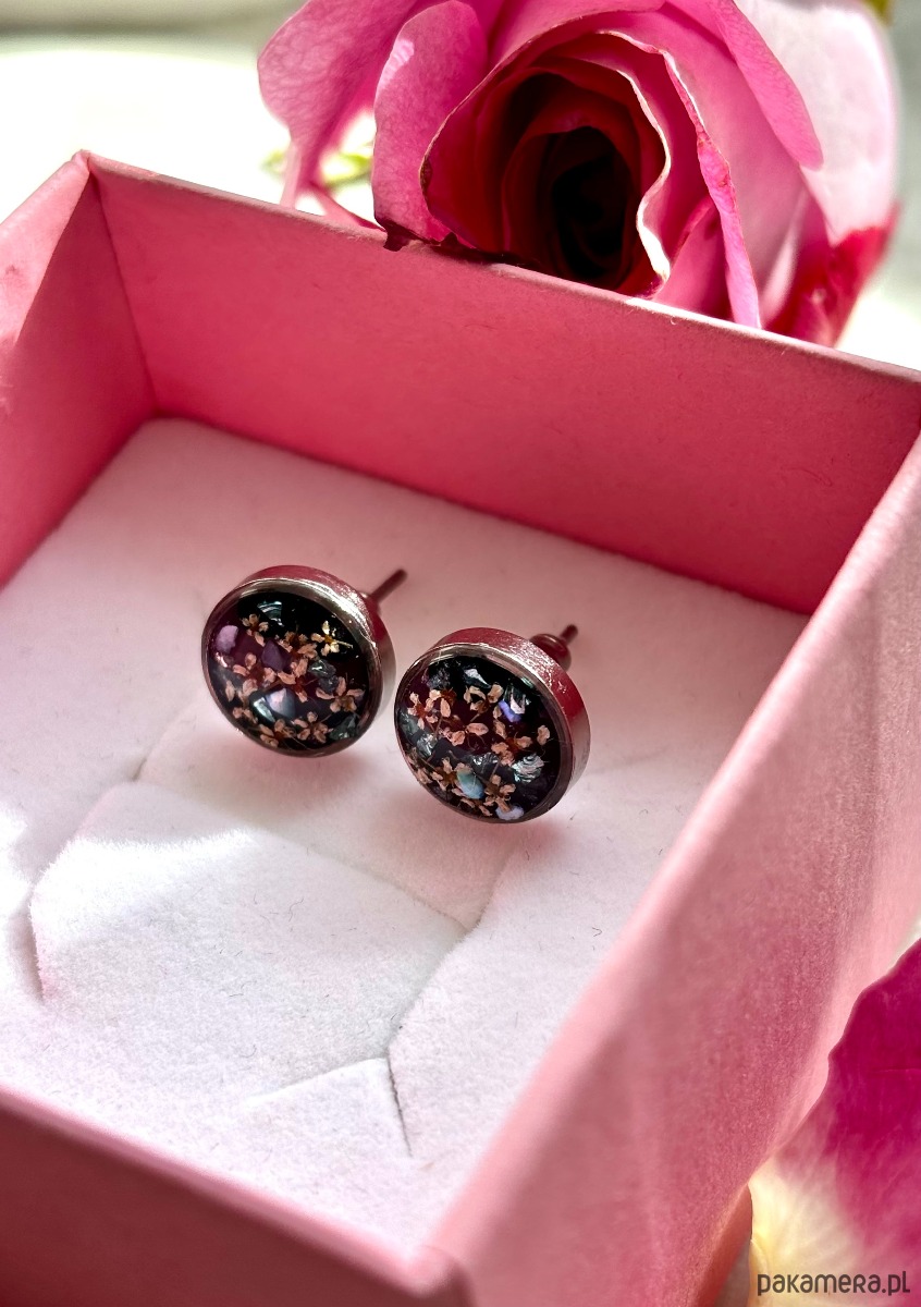 Ręcznie wykonane kolczyki z okrągłymi zawieszkami . Biżuteria wykonana jest z wyselekcjonowanych płatków kwiatów dzikiej marchwi, na tle z czarnego szkła. Kolczyki dodatkowo ozdobione są kawałkami szkła i masy perłowej w odcieniach niebieskim i zielonym. Kolczyki pięknie prezentują się na uchu, są efektowne i wyjątkowo lekkie co stanowi komfort noszenia.