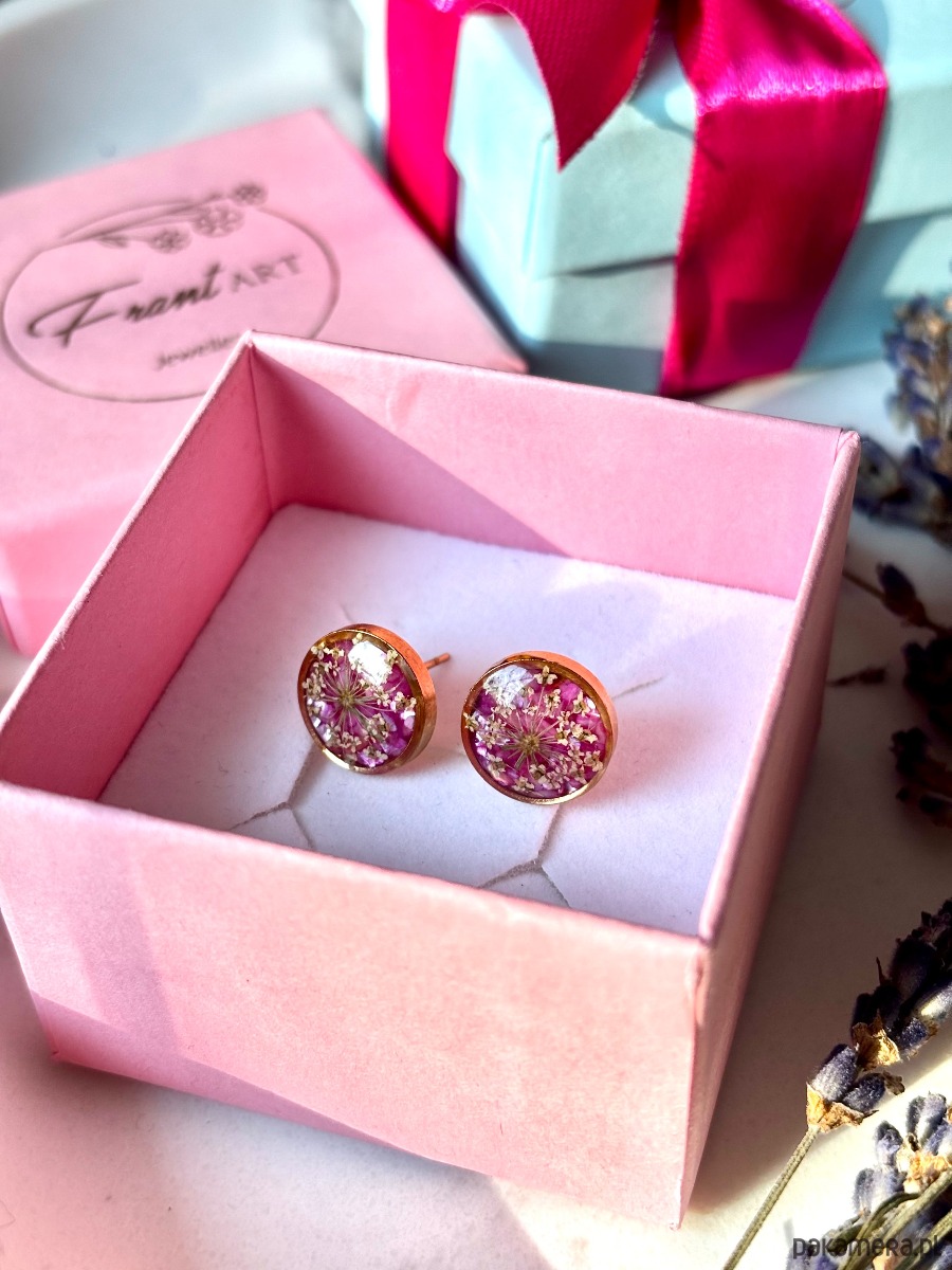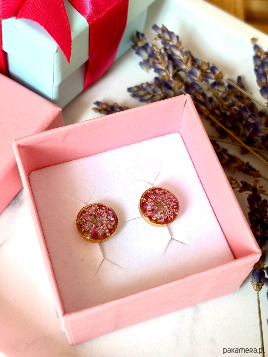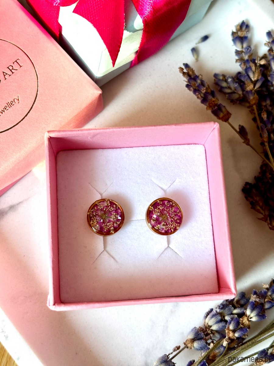Ręcznie wykonane kolczyki z okrągłymi zawieszkami . Biżuteria wykonana jest z wyselekcjonowanych płatków kwiatów dzikiej marchwi, na tle z różowych płatków masy perłowej. Kolczyki pięknie prezentują się na uchu, są efektowne i wyjątkowo lekkie co stanowi komfort noszenia.
