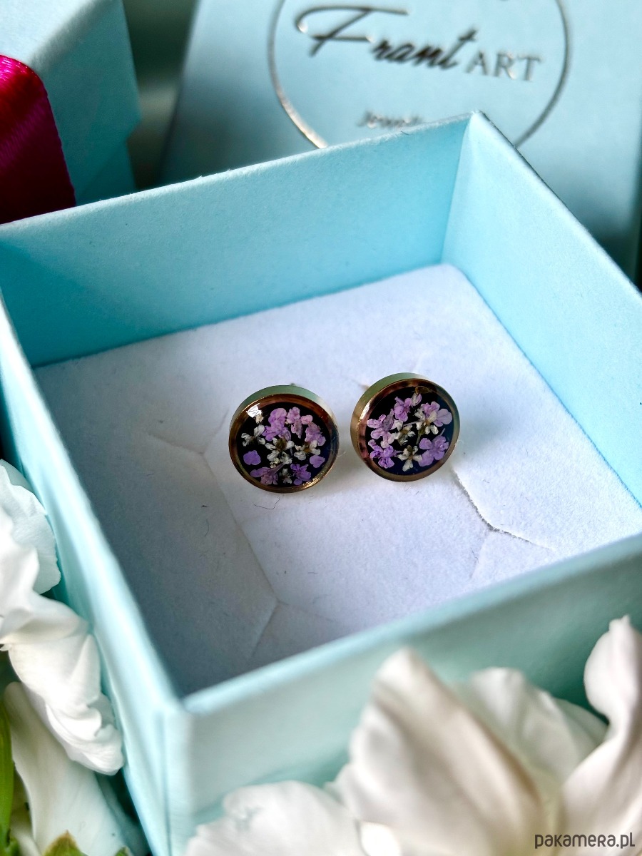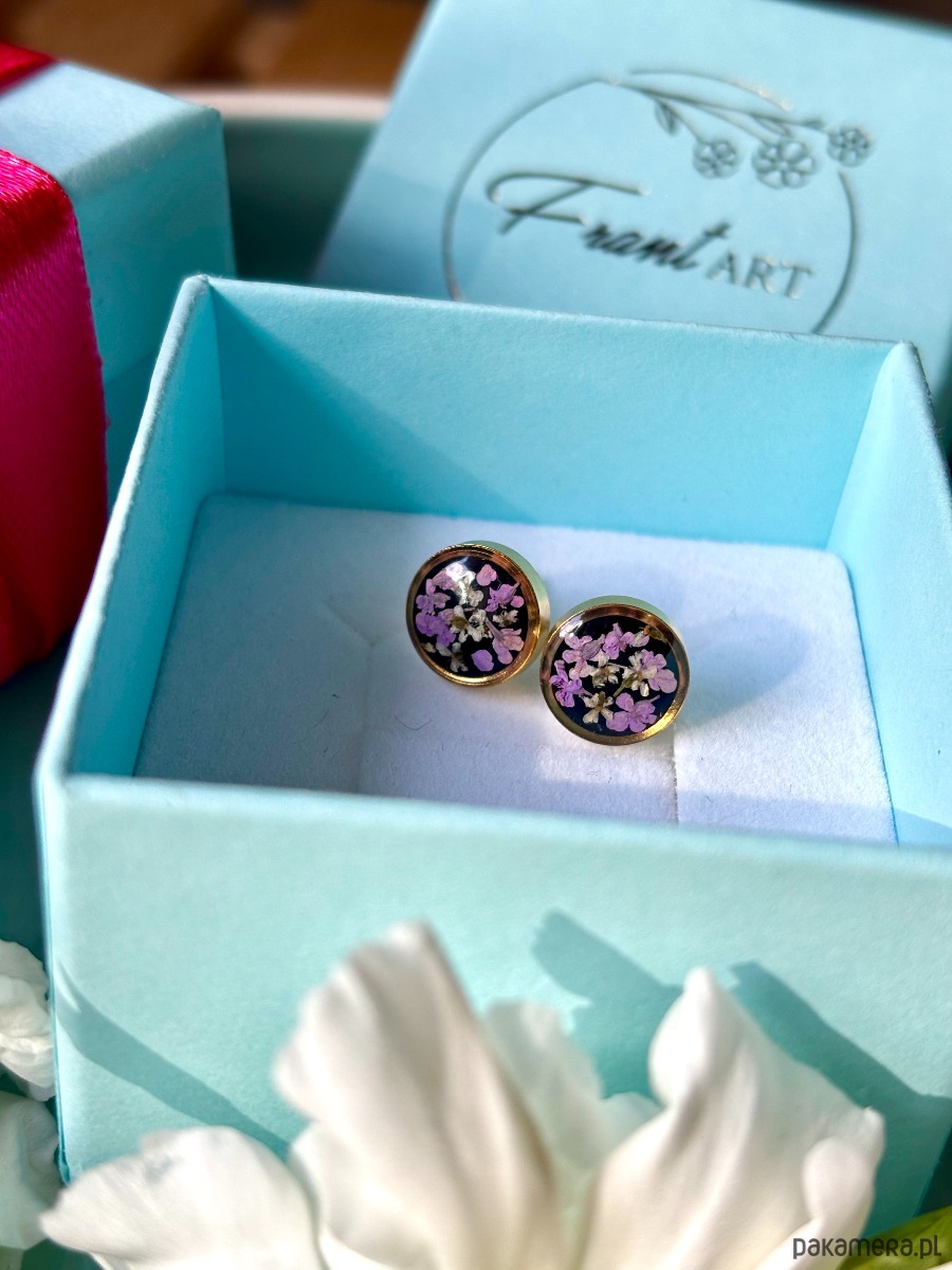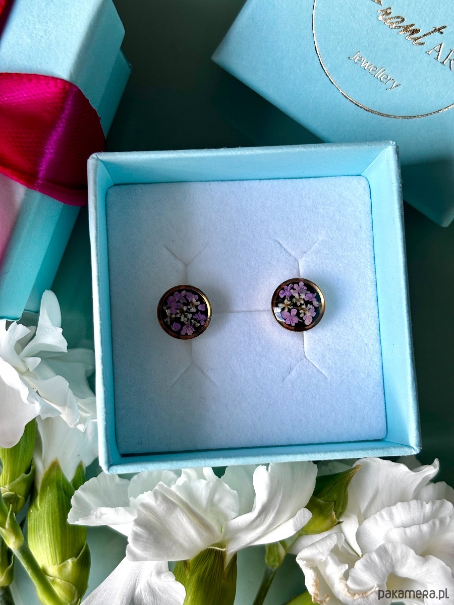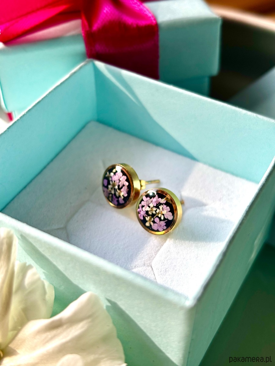Ręcznie wykonane kolczyki z okrągłymi zawieszkami . Biżuteria wykonana jest z wyselekcjonowanych płatków kwiatów dzikiej marchwi w kolorze fioletu i bieli na tle z czarnych kryształków szkła. Kolczyki pięknie prezentują się na uchu, są efektowne i wyjątkowo lekkie co stanowi komfort noszenia.