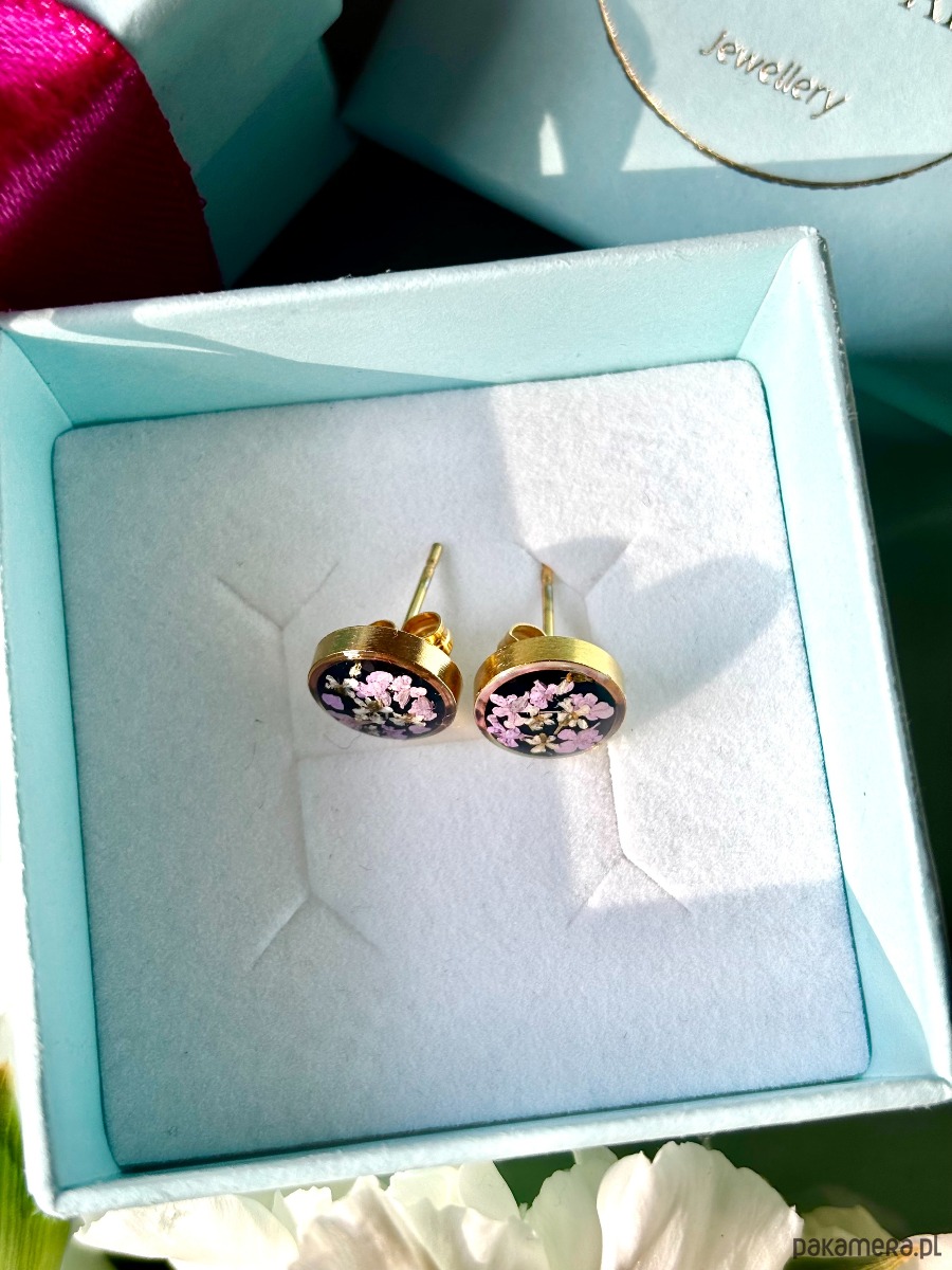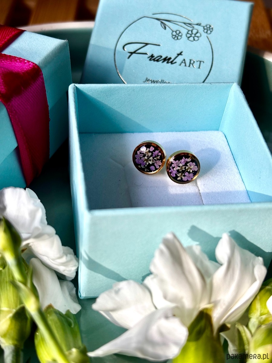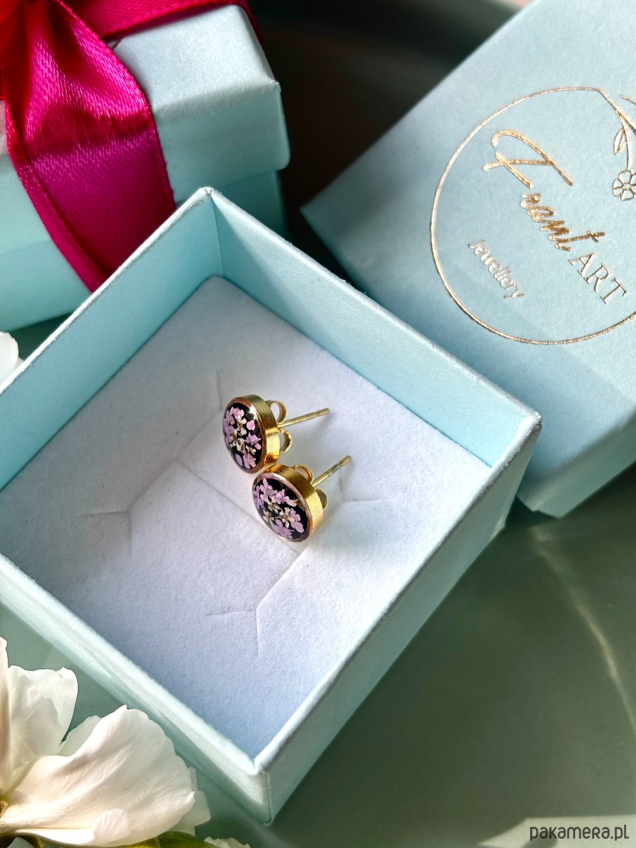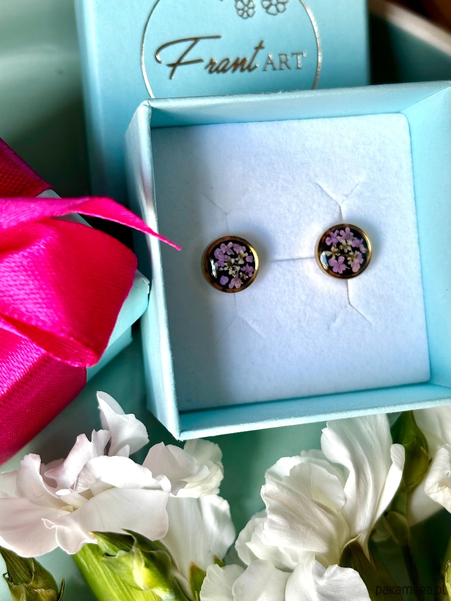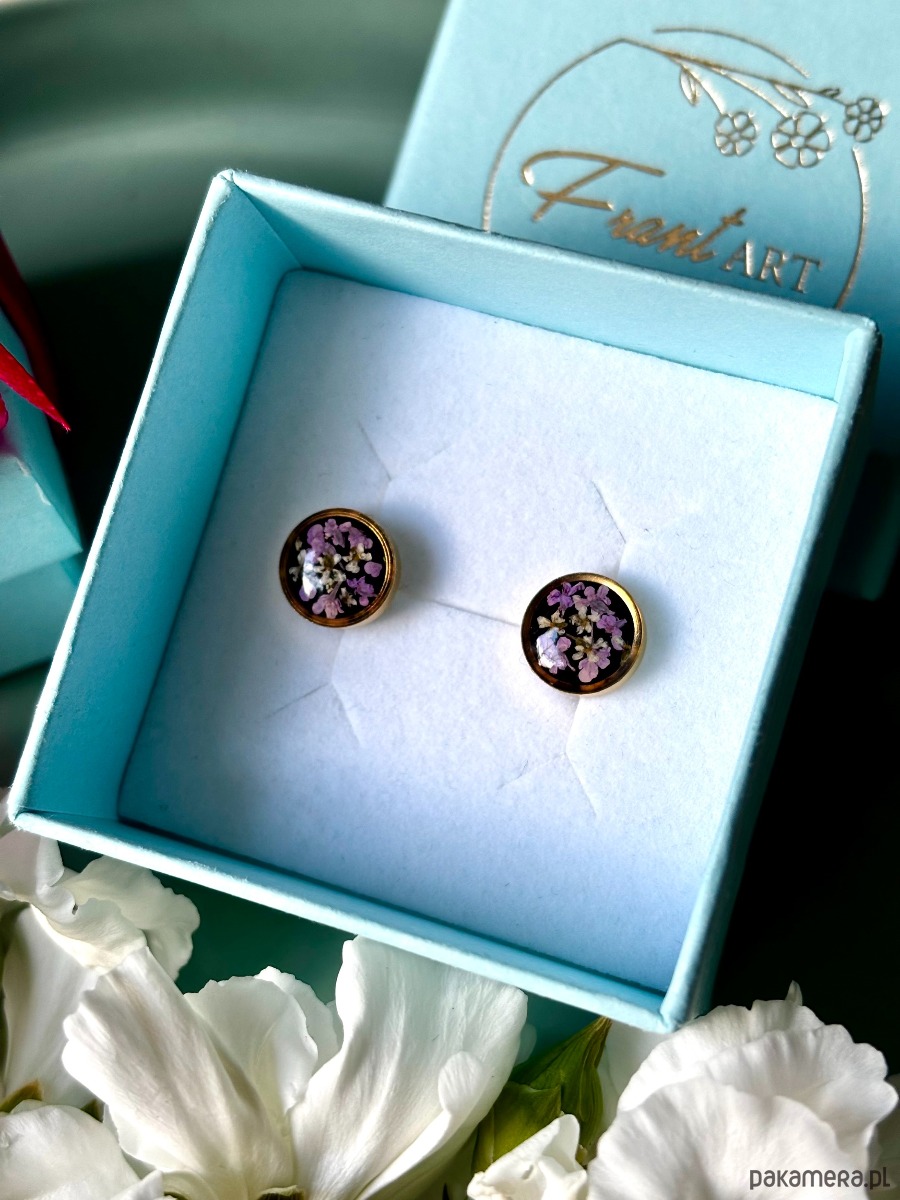 Ręcznie wykonane kolczyki z okrągłymi zawieszkami . Biżuteria wykonana jest z wyselekcjonowanych płatków kwiatów dzikiej marchwi w kolorze fioletu i bieli na tle z czarnych kryształków szkła. Kolczyki pięknie prezentują się na uchu, są efektowne i wyjątkowo lekkie co stanowi komfort noszenia.