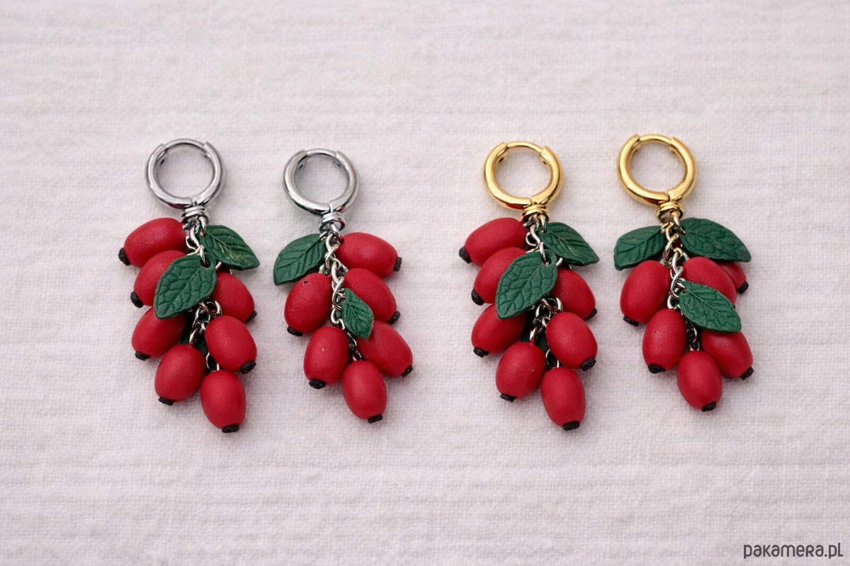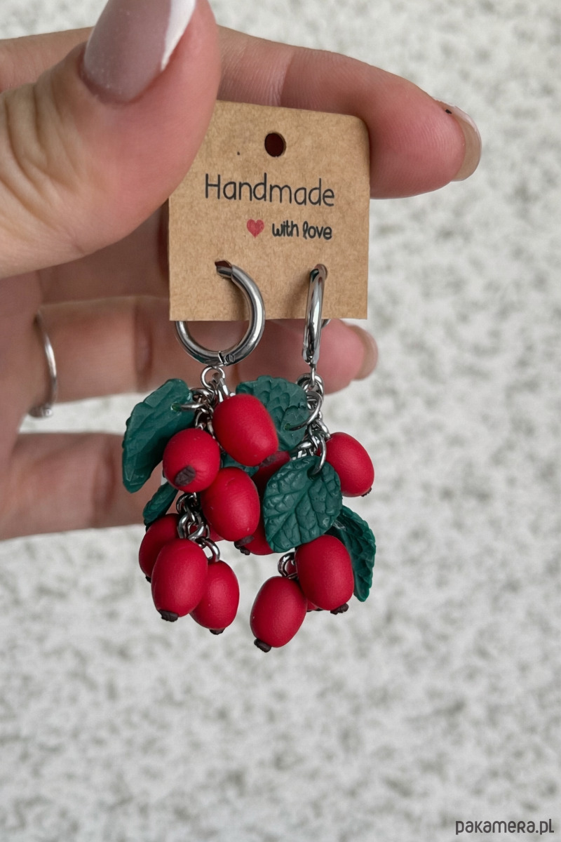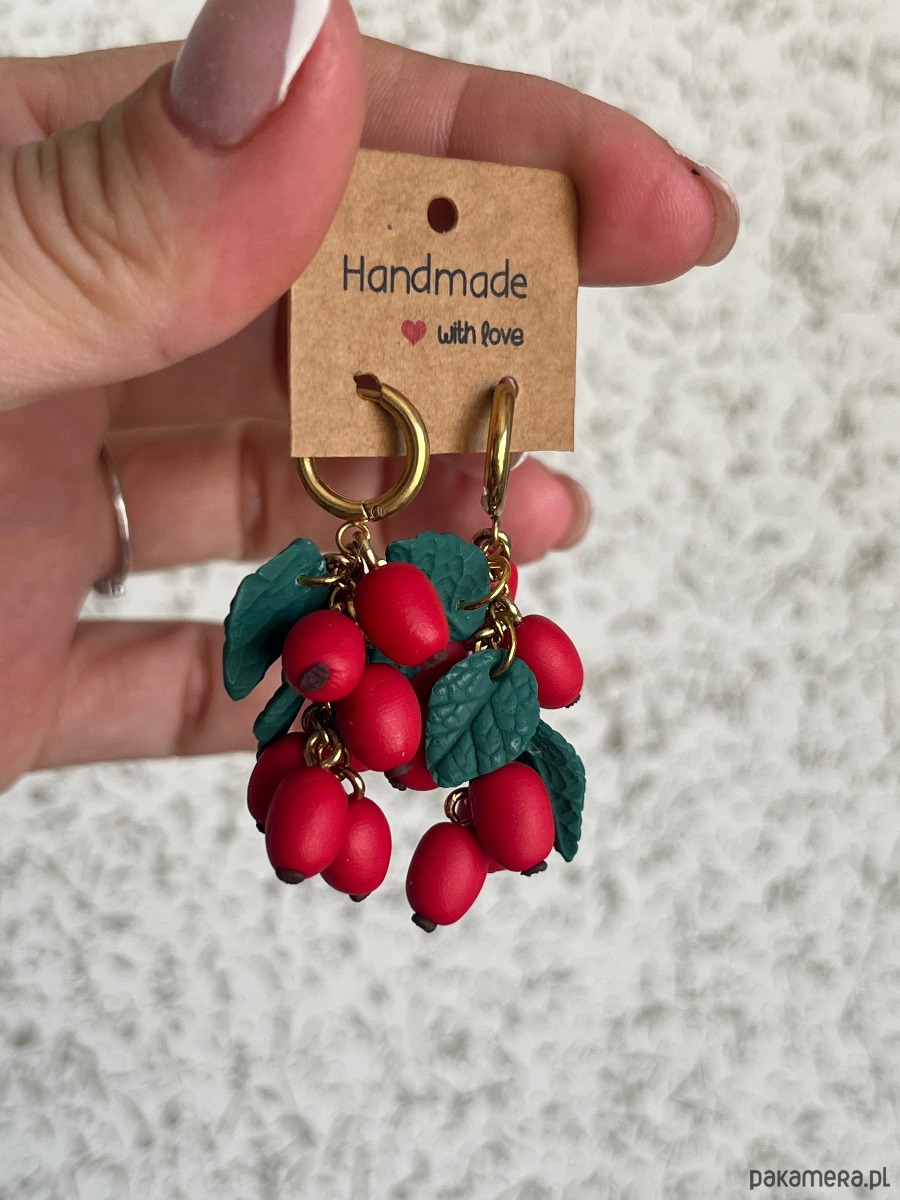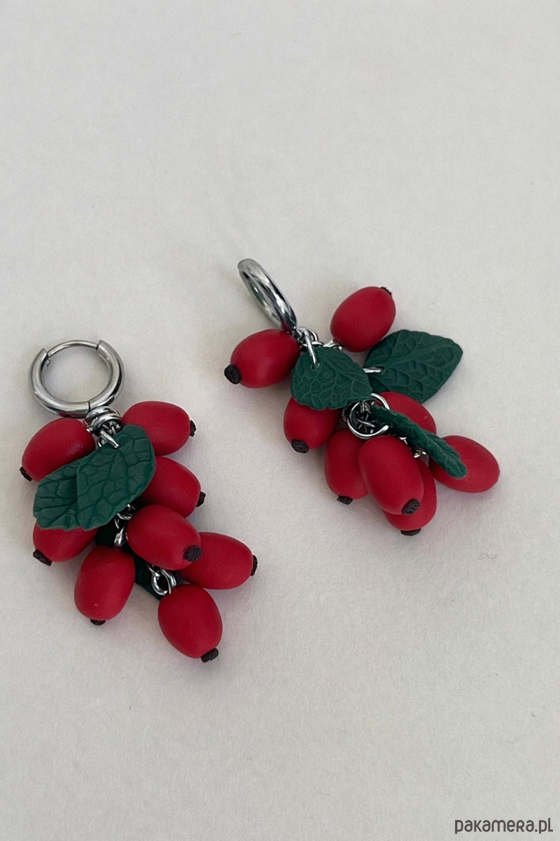 Ręcznie wykonane kolczyki inspirowane owocami dzikiej róży (szypułki).