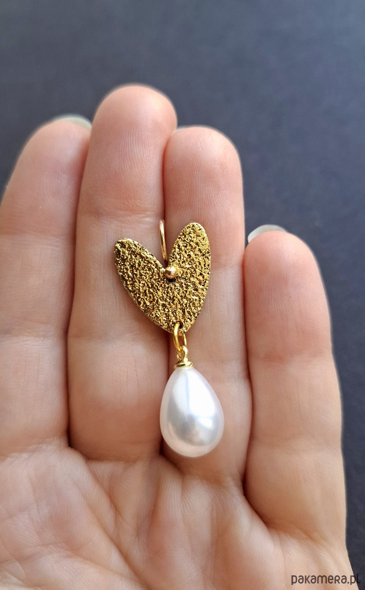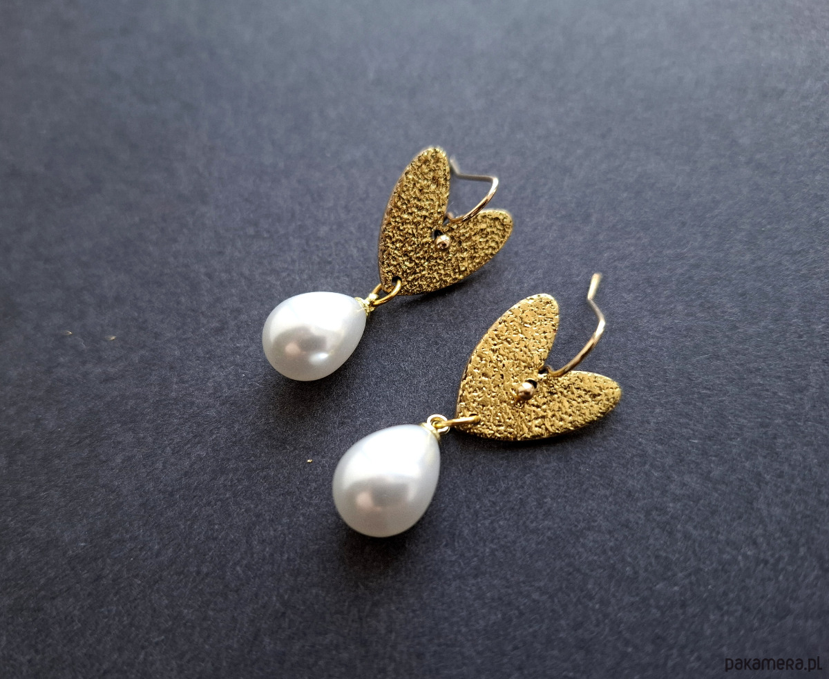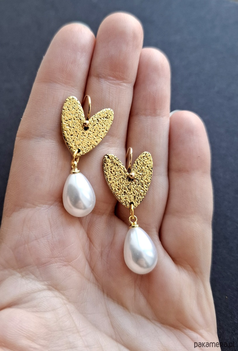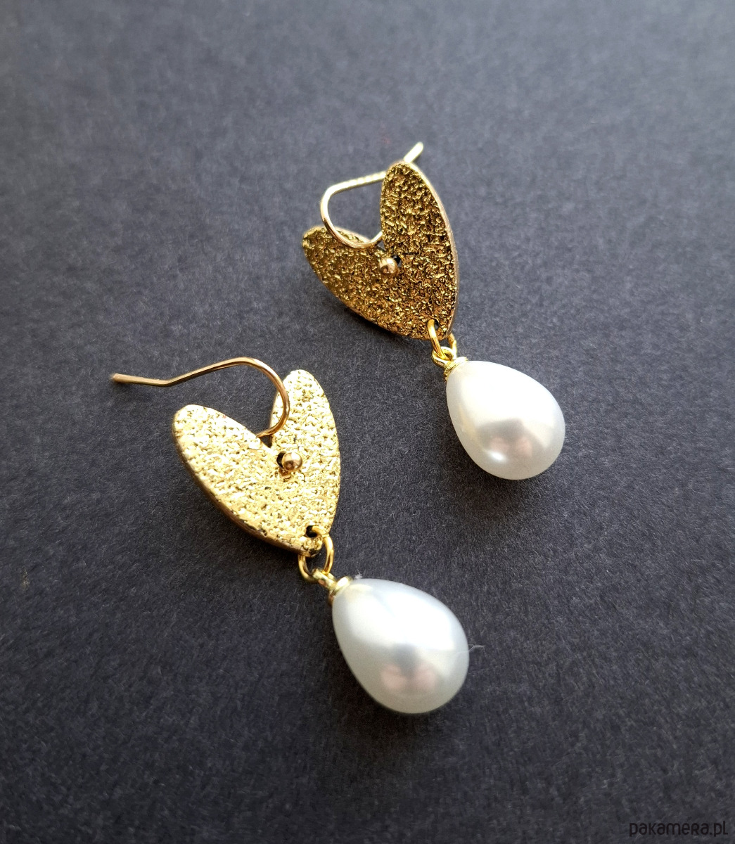 Lekkie, wiszące kolczyki wykonane z wysokiej jakości glinki polimerowej z podwieszonymi szklanymi perełkami. Jednostronne, z prostymi, pozłacanymi i nieuczulającymi biglami. Wymiary: długość całkowita: 3,7 cm; szerokość max. 1,5 cm.