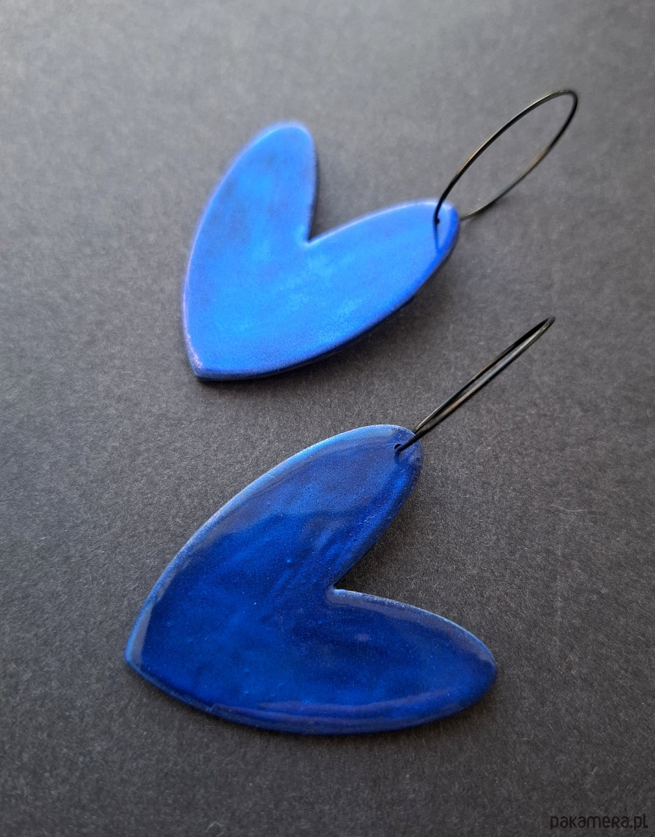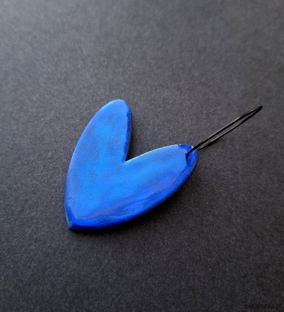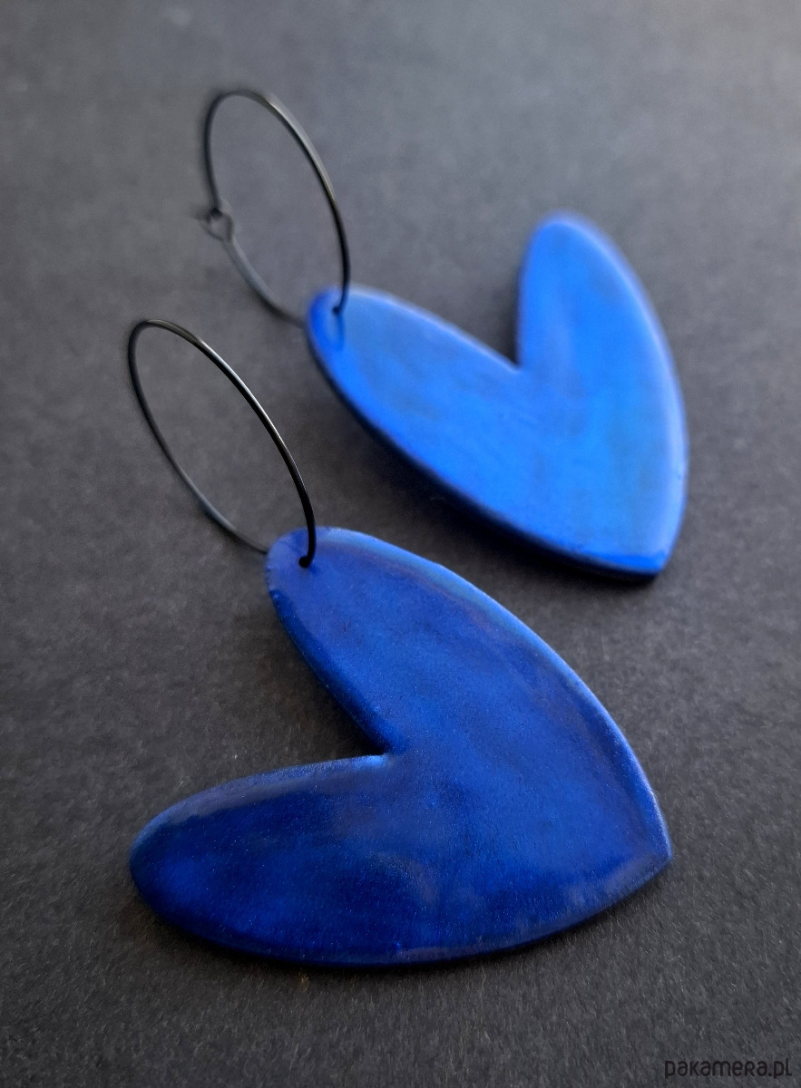 Lekkie, wiszące kolczyki wykonane z wysokiej jakości glinki polimerowej mieniące się w przy padaniu światła. Jednostronne, podwieszone na kolistych, czarnych i nieuczulających biglach z prostym zapięciem. Wymiary: długość całkowita: 6,3 cm; szerokość max. 3,5 cm.