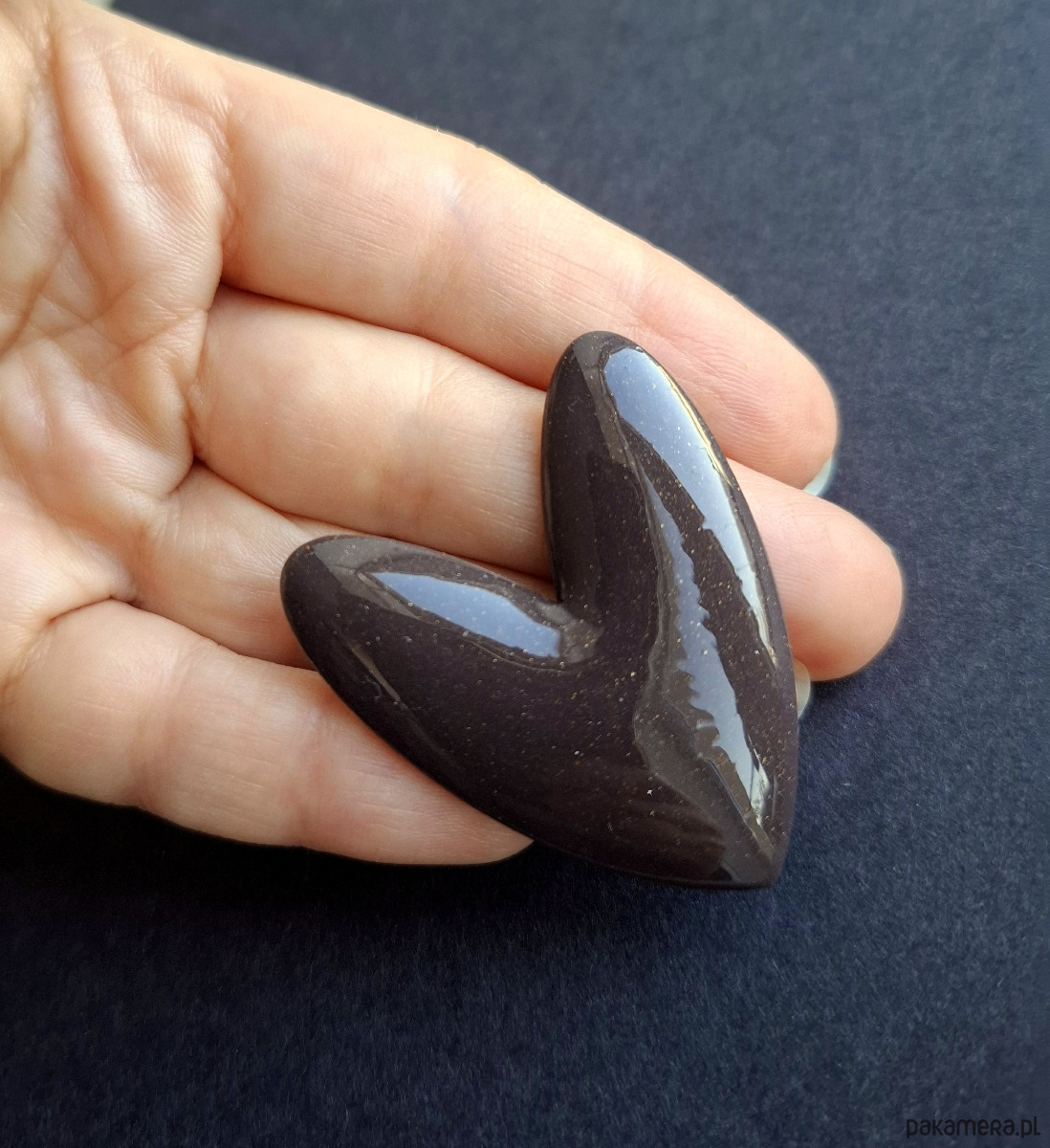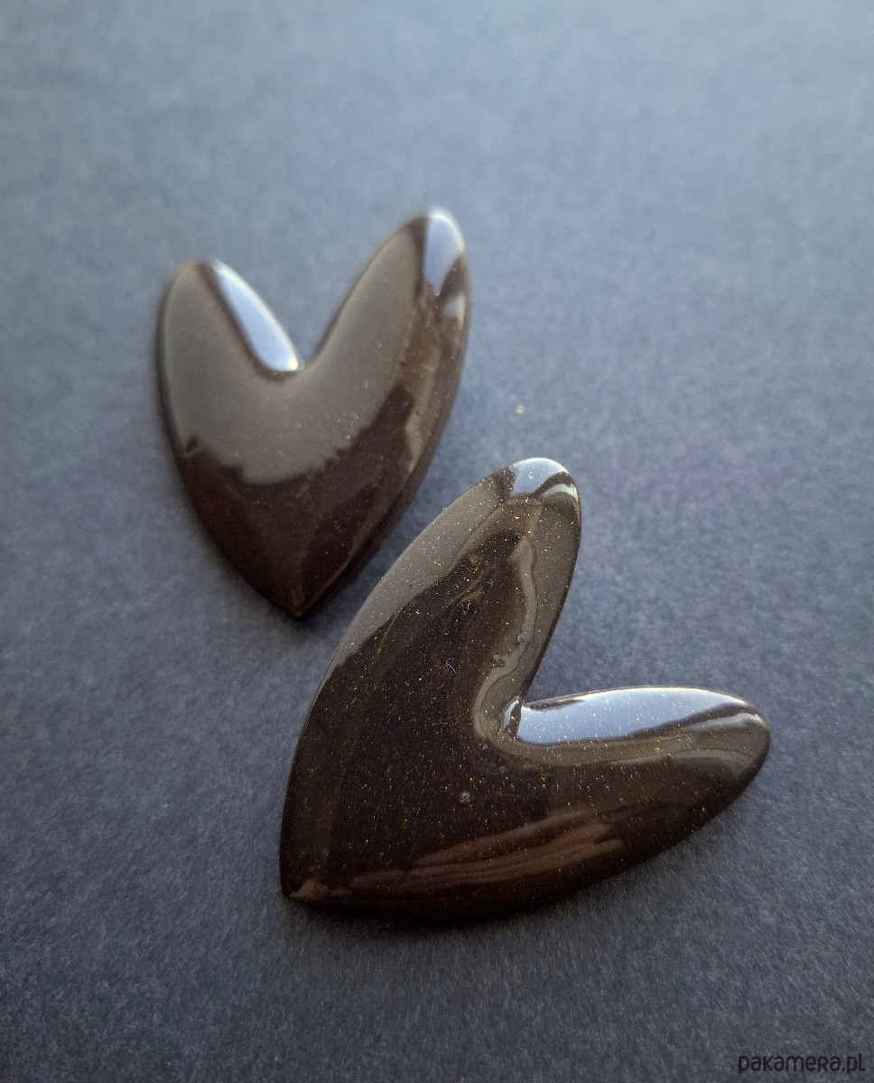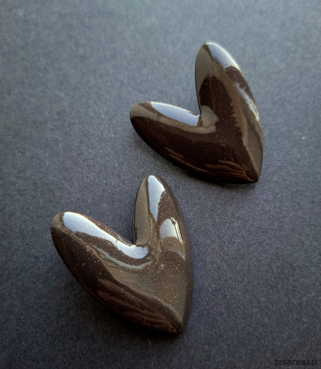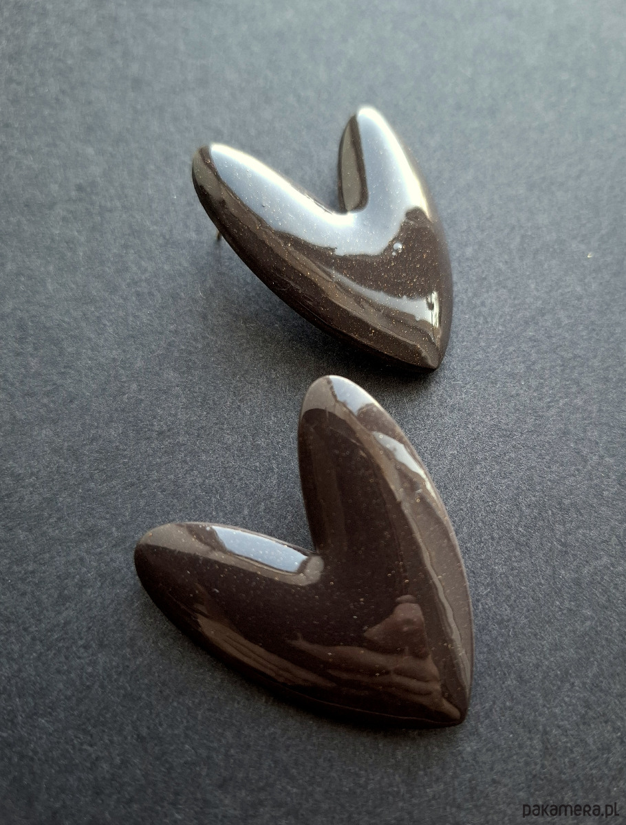 Efektowne, lekkie kolczyki na sztyfty wykonane z wysokiej jakości glinki polimerowej w odcieniu gorzkiej czekolady z drobinkami złota. Jednostronne z pozłacanymi, nieuczulającymi sztyftami. Wymiary: długość wraz z zapięciem: 4,5 cm; szerokość max. 3,8 cm. Wykonane w jedynym egzemplarzu.