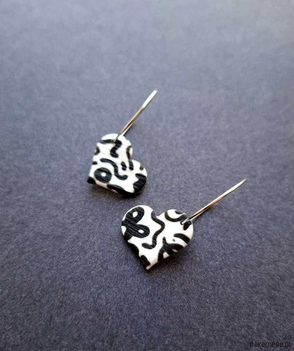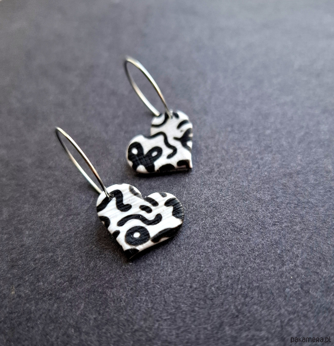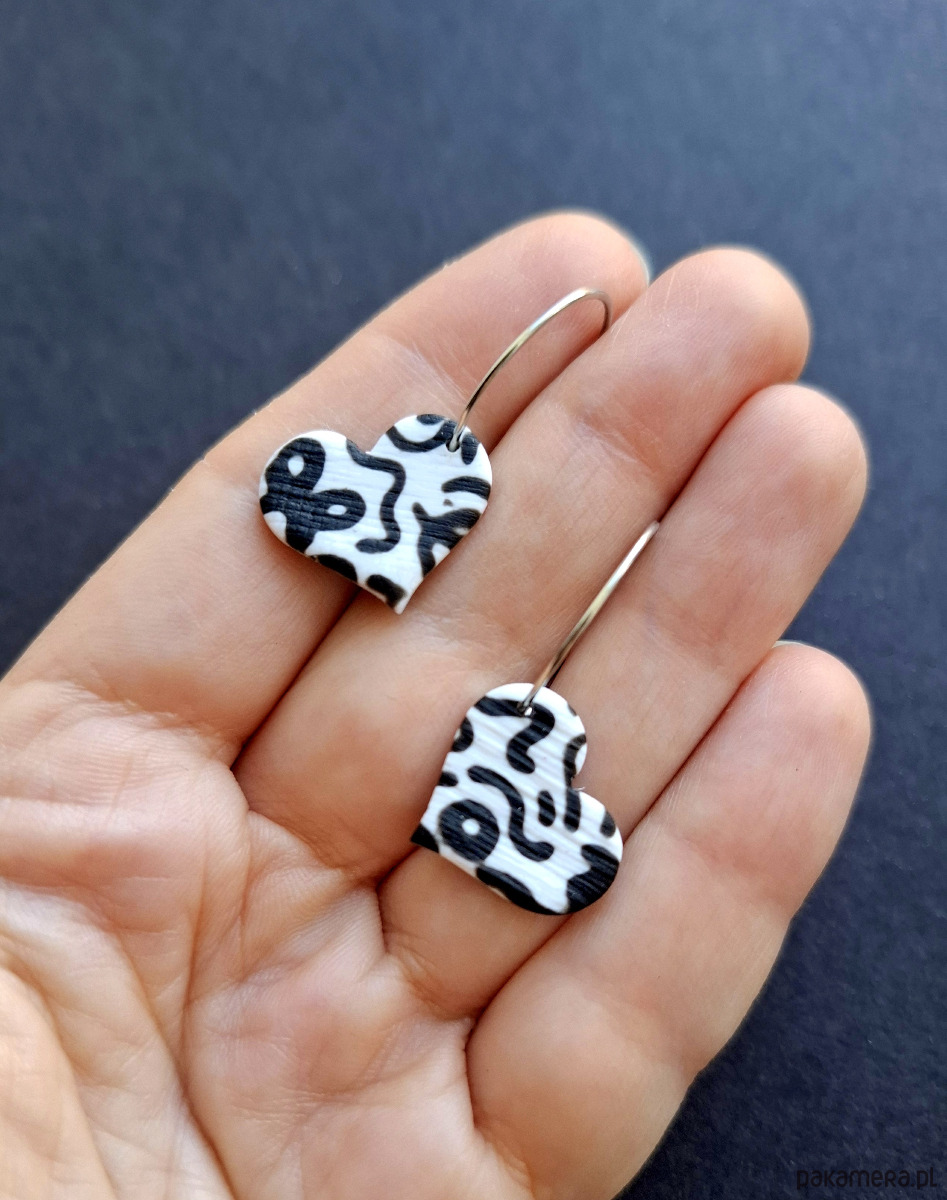 Lekkie, wiszące kolczyki wykonane z wysokiej jakości glinki polimerowej. Jednostronne, podwieszone na kolistych, posrebrzanych i nieuczulających biglach z prostym zapięciem. Wymiary: długość całkowita: 3,2 cm; szerokość max. 1,8 cm.