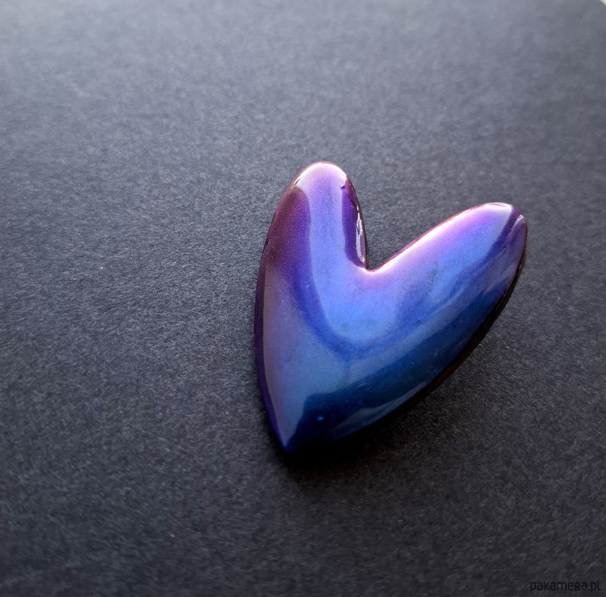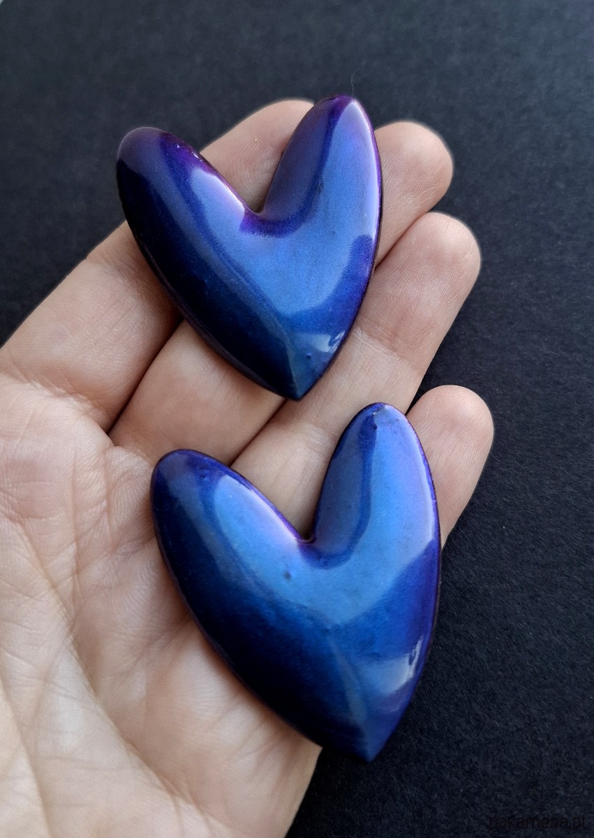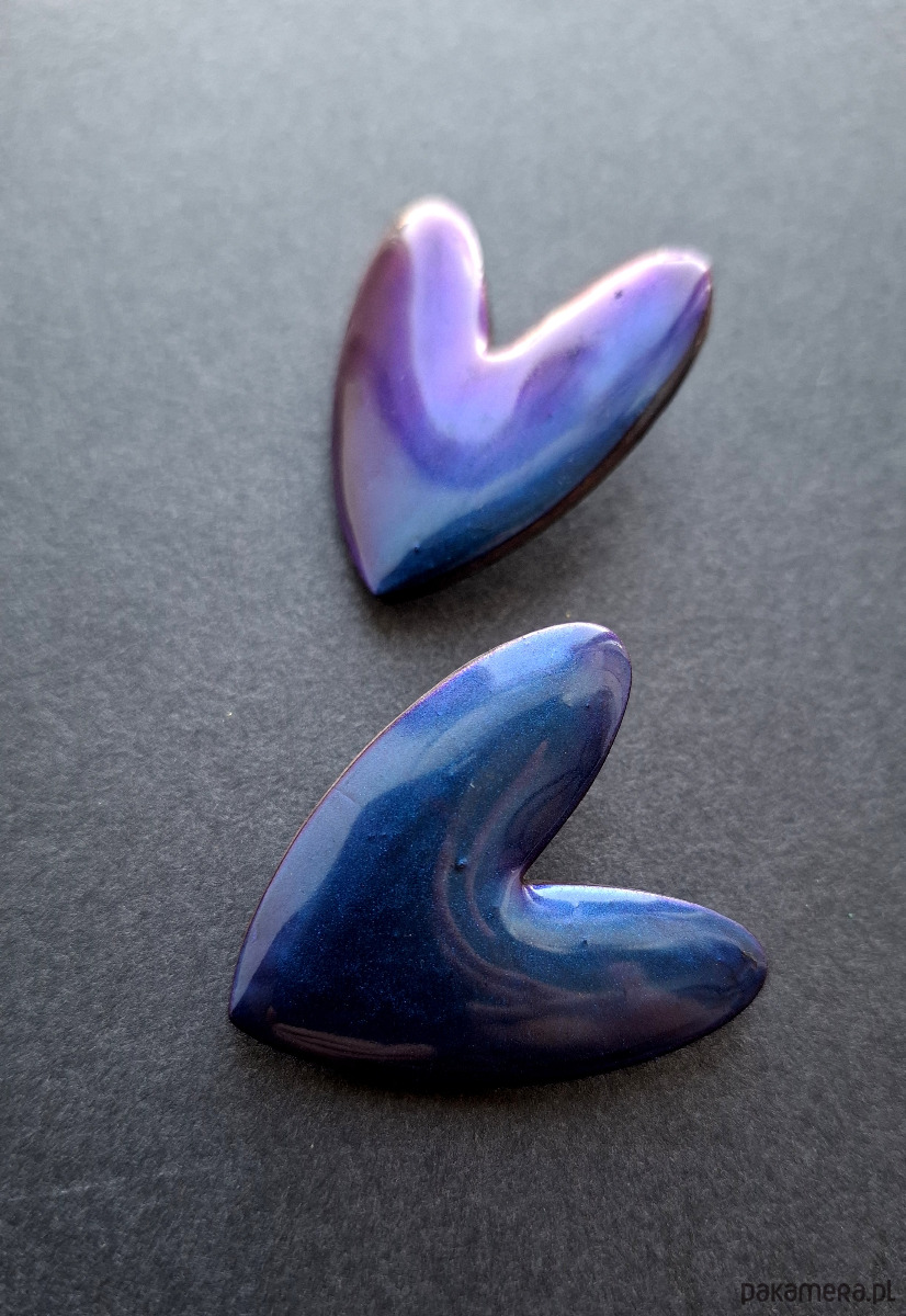 Efektowne, lekkie kolczyki na sztyfty wykonane z wysokiej jakości glinki polimerowej, mieniące się barwami przy padaniu światła. Jednostronne z posrebrzanymi, nieuczulającymi sztyftami. Wymiary: długość wraz z zapięciem: 4,5 cm; szerokość max. 3,8 cm. Wykonane w jedynym egzemplarzu.