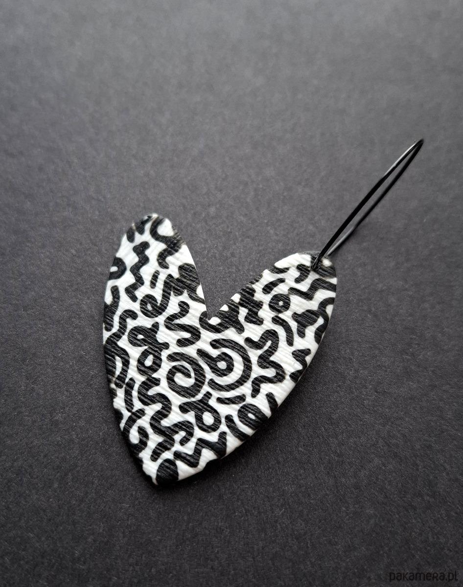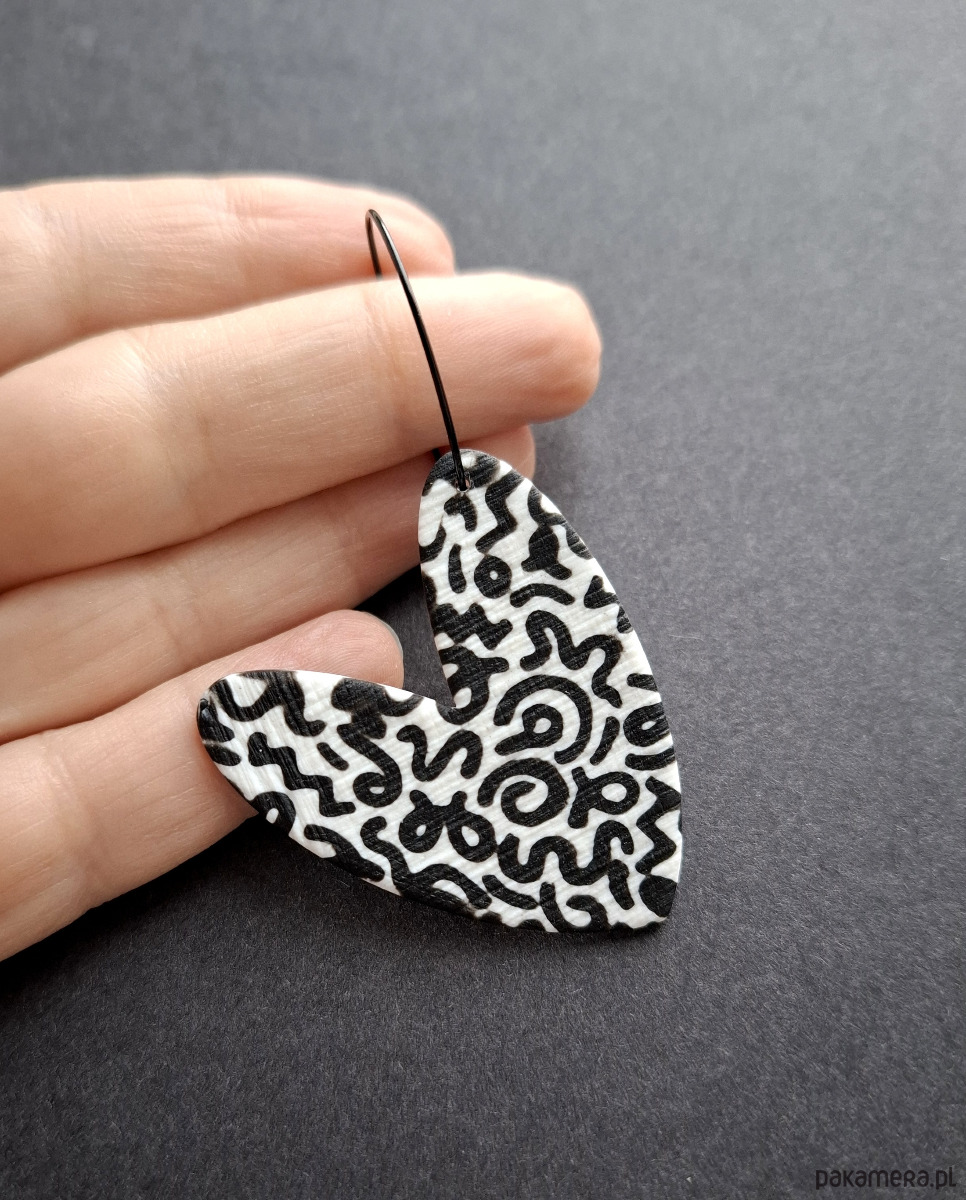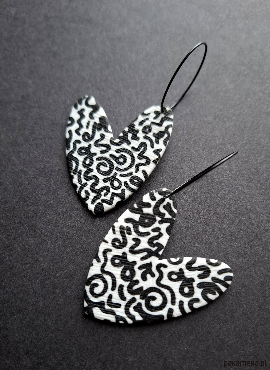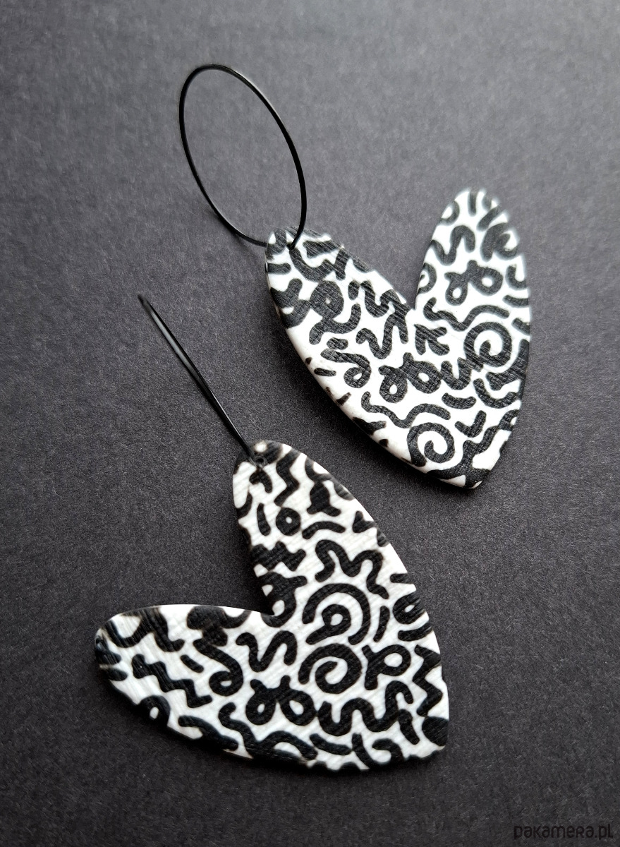 Lekkie, wiszące kolczyki wykonane z wysokiej jakości glinki polimerowej. Jednostronne, podwieszone na kolistych, nieuczulających biglach z prostym zapięciem. Wymiary: długość całkowita: 6,8 cm; szerokość max. 3,8 cm.