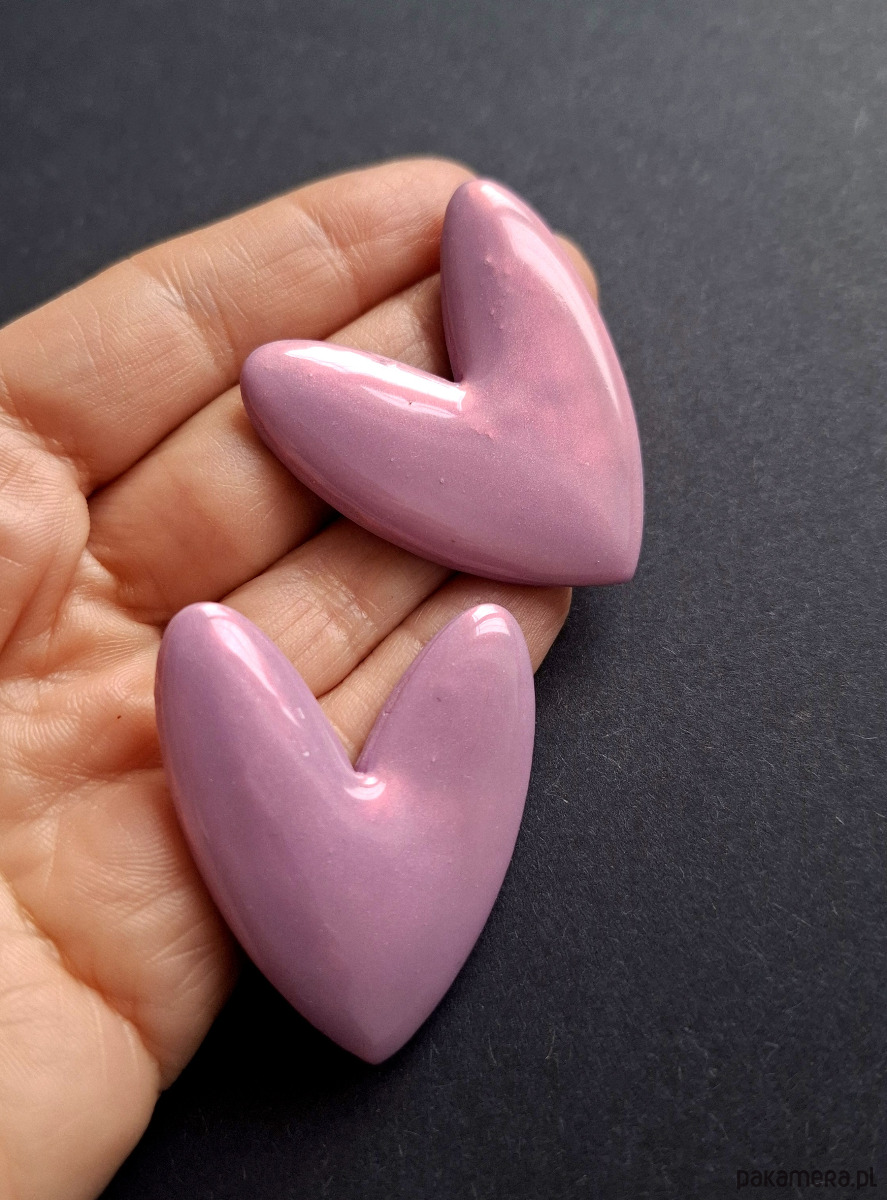 Efektowne, lekkie kolczyki na sztyfty wykonane z wysokiej jakości glinki polimerowej, mieniące się w przy padaniu światła. Jednostronne z posrebrzanymi, nieuczulającymi sztyftami. Wymiary: długość wraz z zapięciem: 4,5 cm; szerokość max. 3,8 cm. Wykonane w jedynym egzemplarzu.