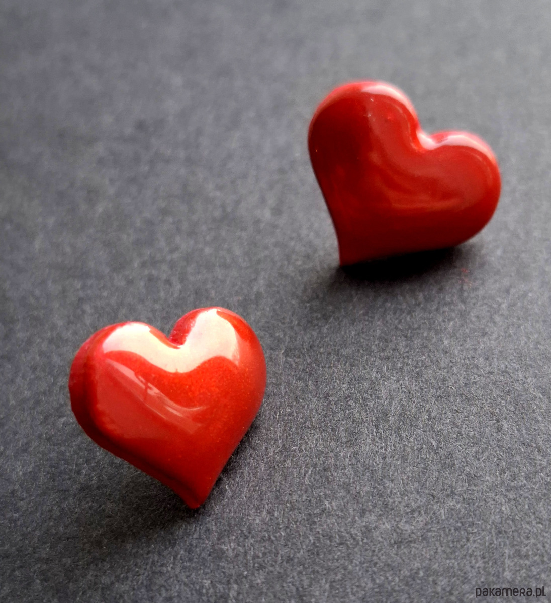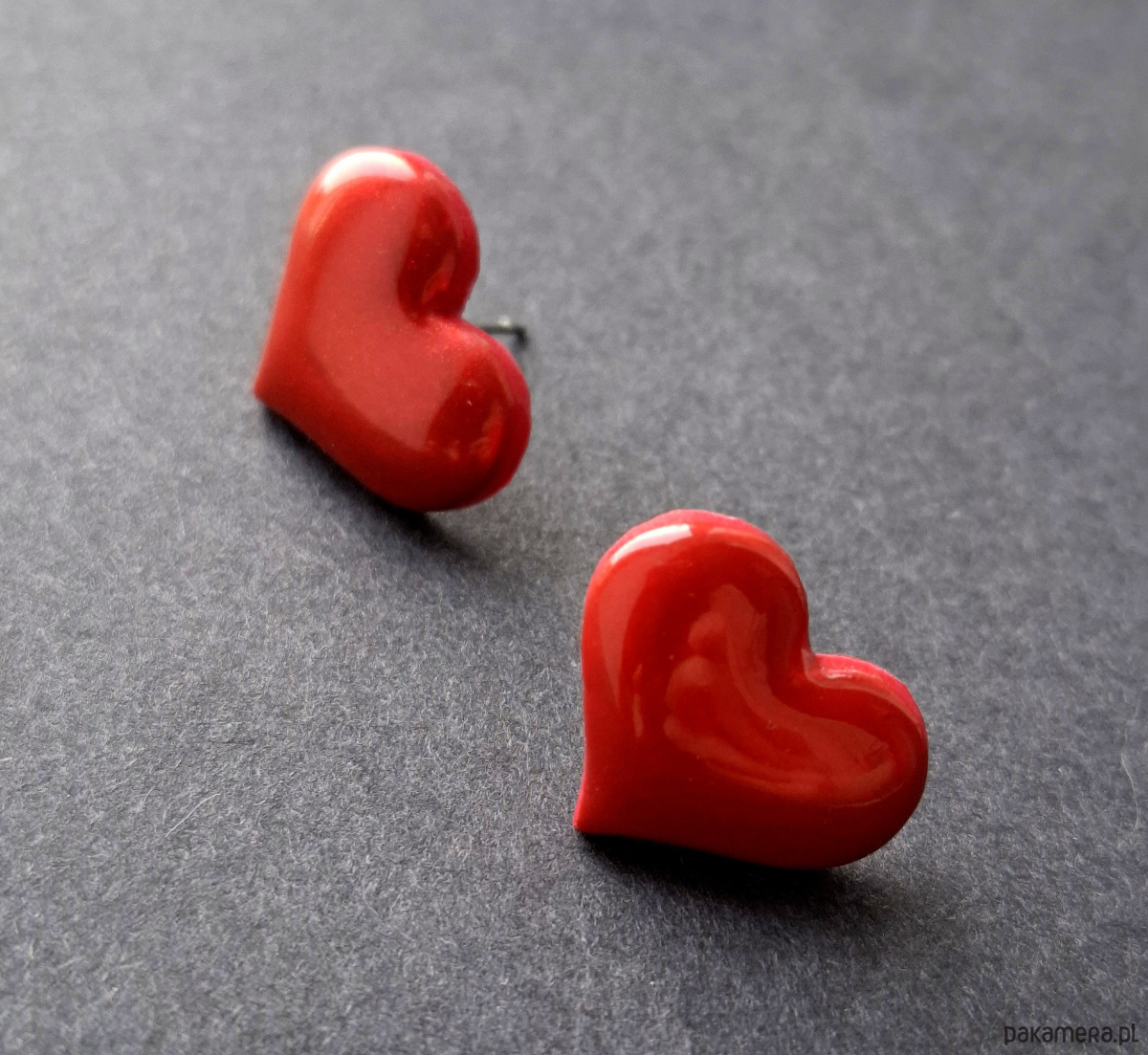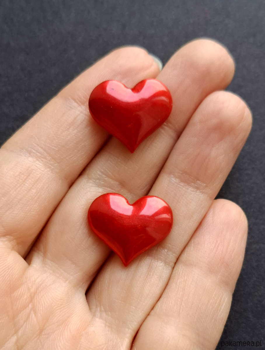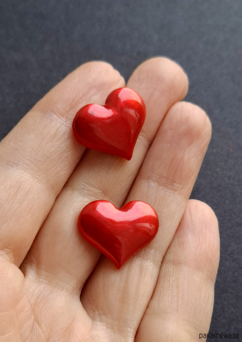Kolczyki na sztyfty wykonane z wysokiej jakości glinki polimerowej. Jednostronne z posrebrzanymi, nieuczulającymi sztyftami. Wymiary: długość wraz z zapięciem: 1,6 cm; szerokość max. 1,8 cm.