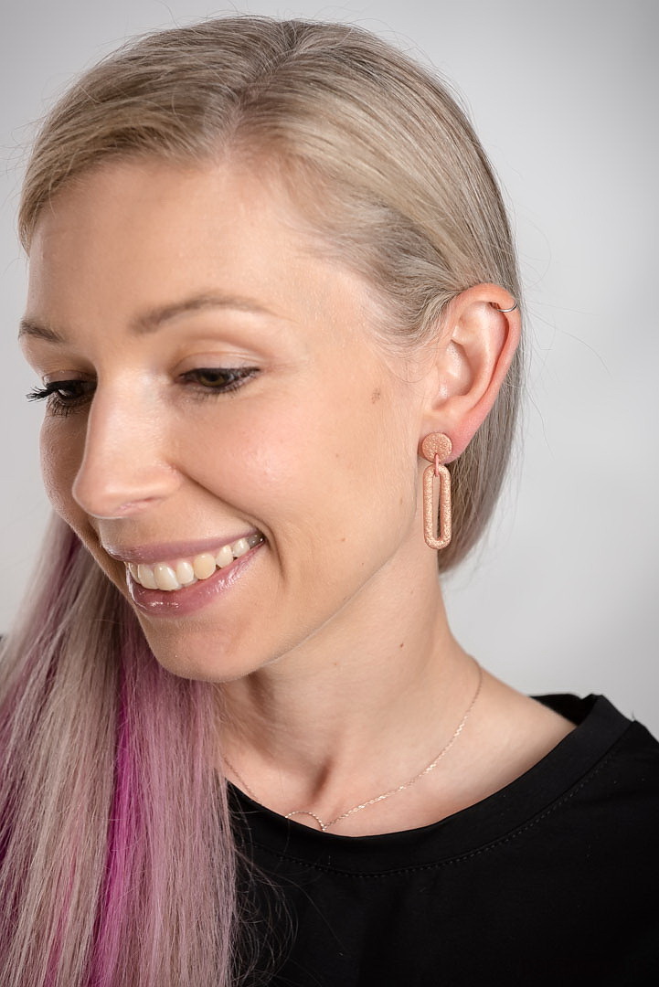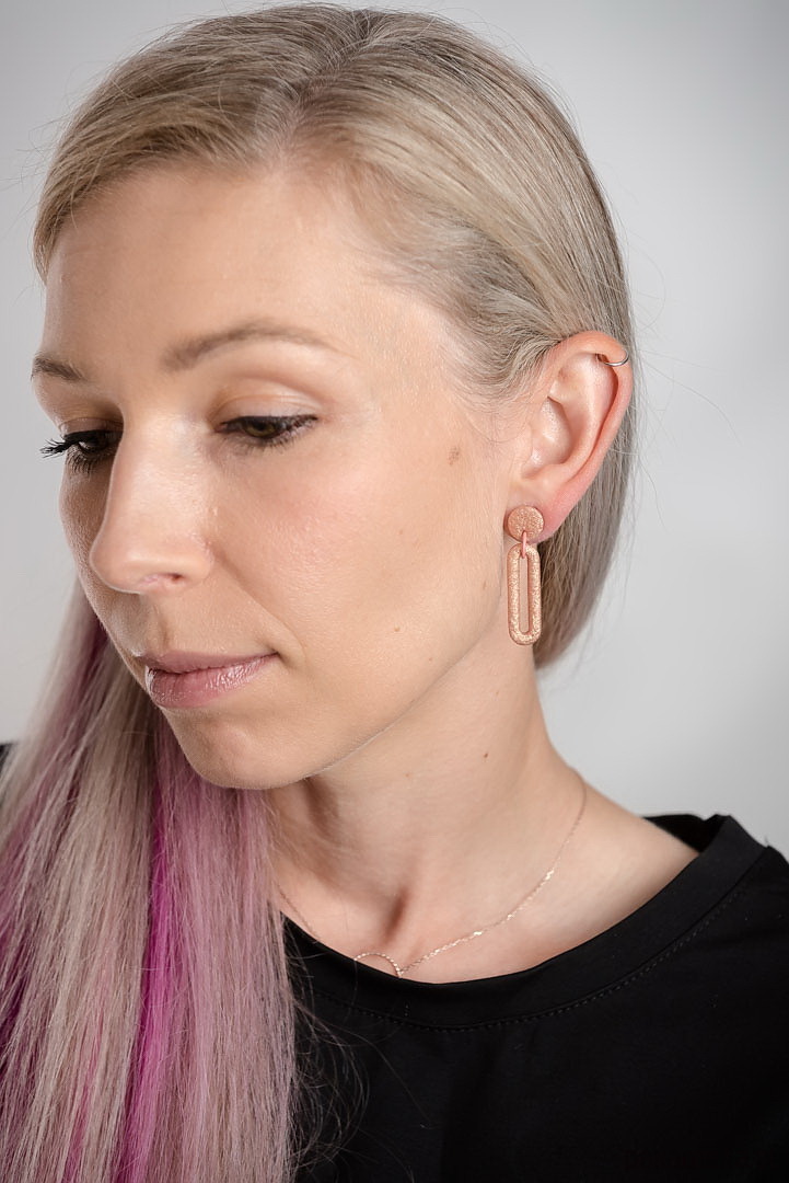 Kolczyki Emma to wiszące, oryginalne kolczyki, z subtelną fakturą, wykonane ręcznie z profesjonalnej glinki polimerowej, ze sztyftem ze stali szlachetnej. Są lekkie, dość elastyczne i dzięki temu wygodne oraz odporne na uszkodzenia.