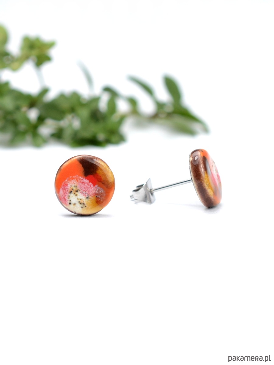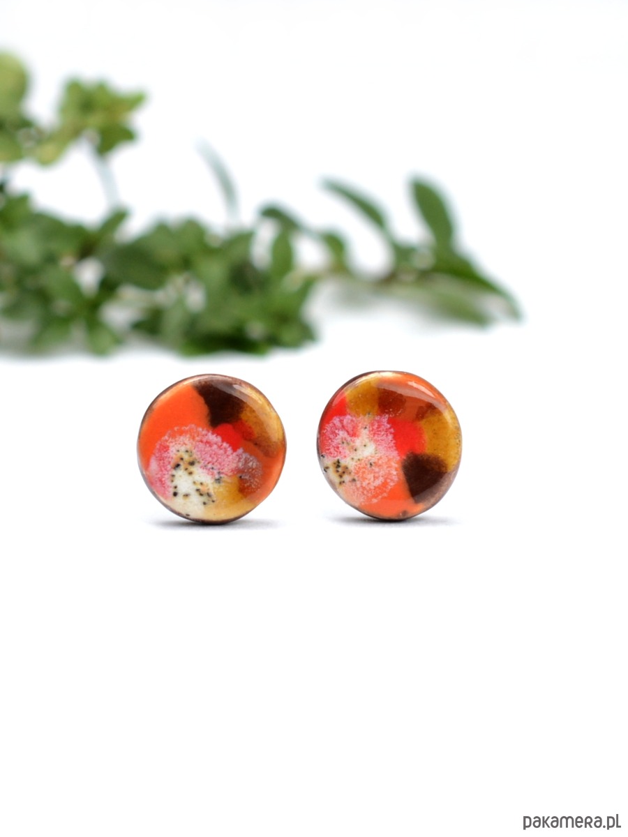 Kolczyki to ceramiczne kółeczka o średnicy 9mm i grubości 2mm. Elementy ozdobiłam mieszanką szkliw, które dały niepowtarzalny efekt przenikających się kolorów: odcienie brązy, czerwieni ,beżu i pomarańczu. Boczne krawędzie również są poszkliwione w kolorze ciemnego brązu