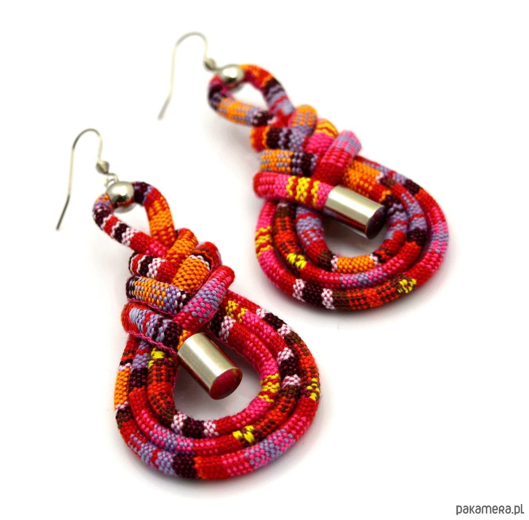 Etniczne, lekkie kolczyki misternie wyplecione z okrągłego, szytego rzemienia-liny z tkaniny o średnicy 4mm. Do ich wykonania użyto ponadto elementów metalowych ze stali szlachetnej.
