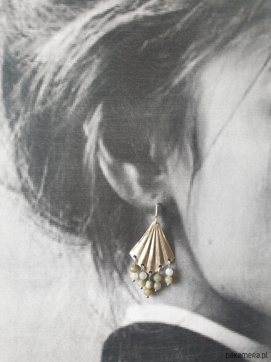 Duże wiszące kolczyki z kolekcji FAN, w kształcie wachlarzy na długich sztyftach z surowego mosiądzu z kamieniami naturalnymi, kulkami labradorytu. Kolczyki są ręcznie wycinane, młotkowane, matowione i formowane stąd ich niedoskonały urok i każda para jest wyjątkowa. Kolczyki tworzone na zamówienie, na zdjęciu przykładowa para.