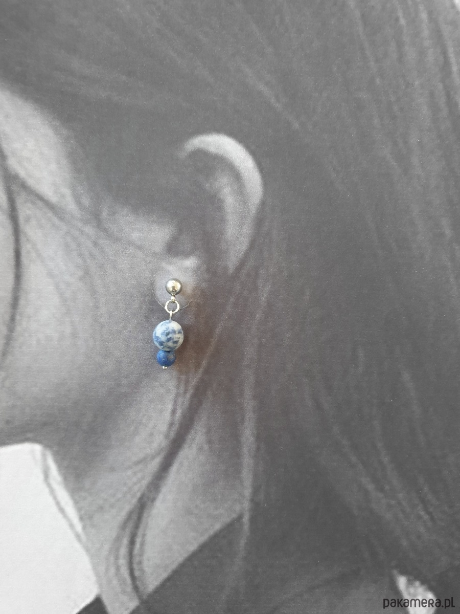Duże kolczyki FANABERIA w duchu minimalizmu, z kulkami jaspis niebieski i lapis lazuli, idealne na wieczorne wyjście ale też na co dzień.