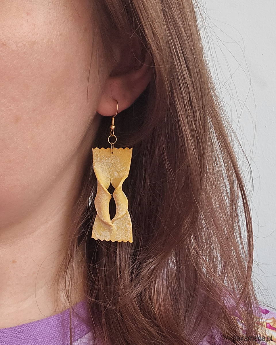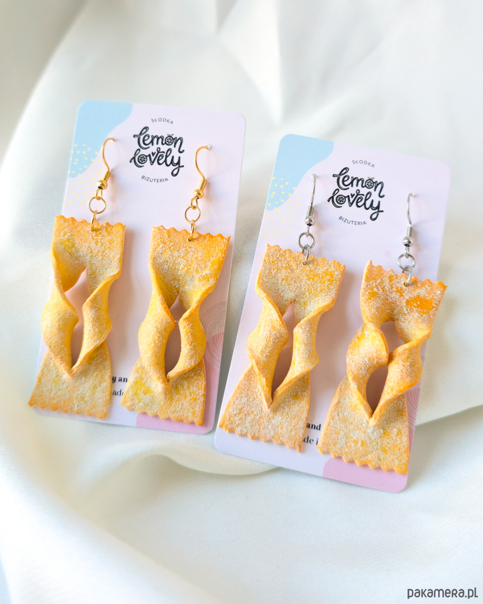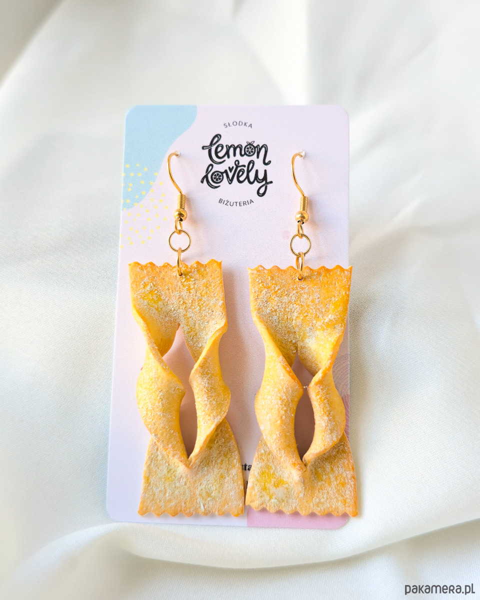 Urocze kolczyki - tradycyjne faworki obsypane cukrem pudrem. Słodycze zostały wykonane ręcznie z wytrzymałej i lekkiej masy polimerowej. Długość samych kolczyków to około 5 cm, z biglami 6 cm. Bigle do wyboru srebrne lub ze stali chirurgicznej ( nie uczulają). Kolczyki są bardzo lekkie i bardzo efektowne - oryginalny dodatek nie tylko na tłusty czwartek. Wysyłam ozdobnie zapakowane.