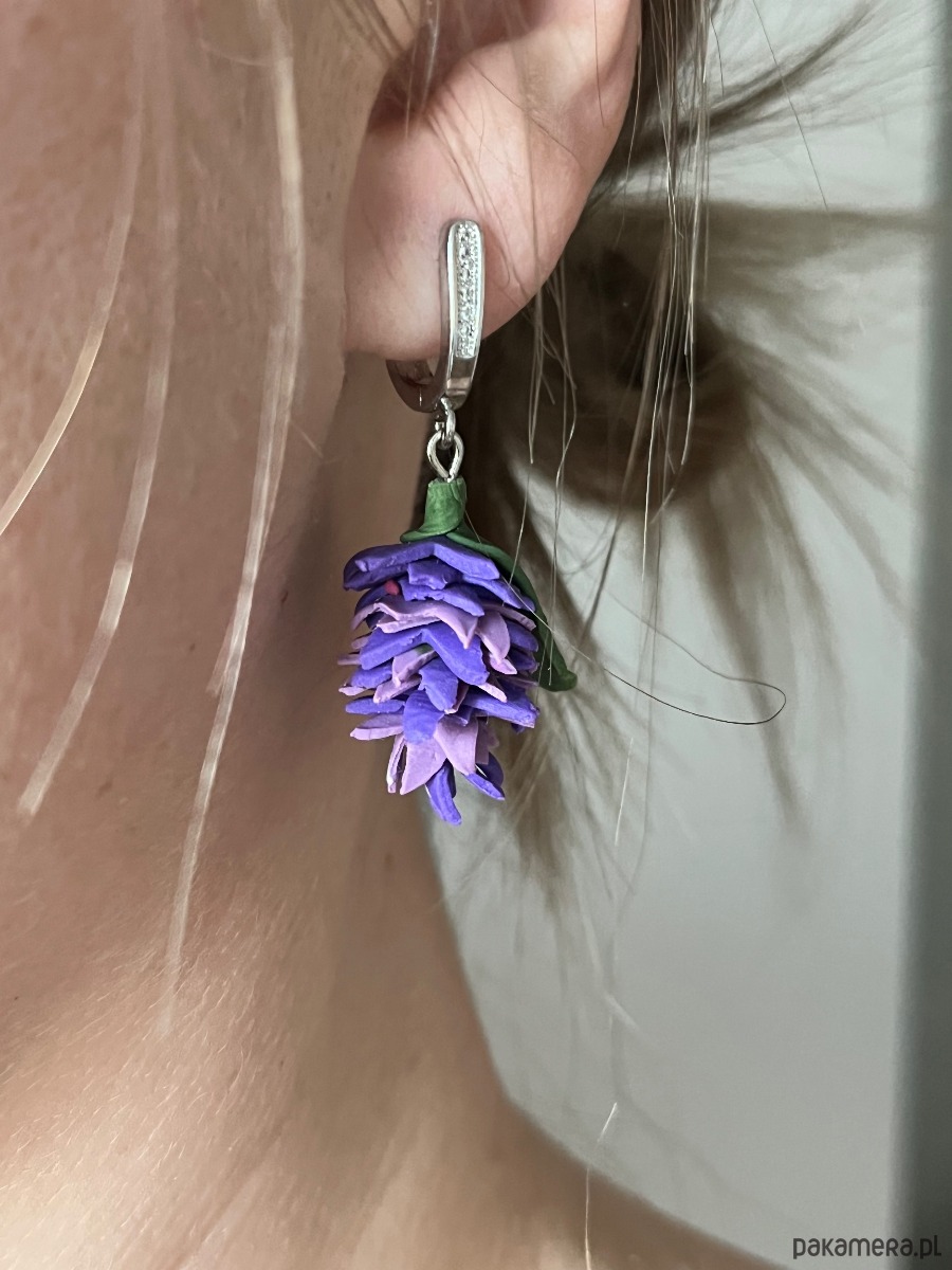 Każdy kolczyk składa się z dziesiątek delikatnych, ręcznie formowanych płatków w nasyconych odcieniach królewskiego fioletu i subtelnej lawendy. Dzięki swojej trójwymiarowej strukturze, kolczyki pięknie pracują ze światłem, dodając stylizacji głębi.