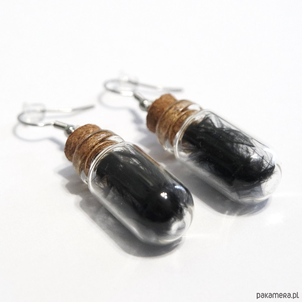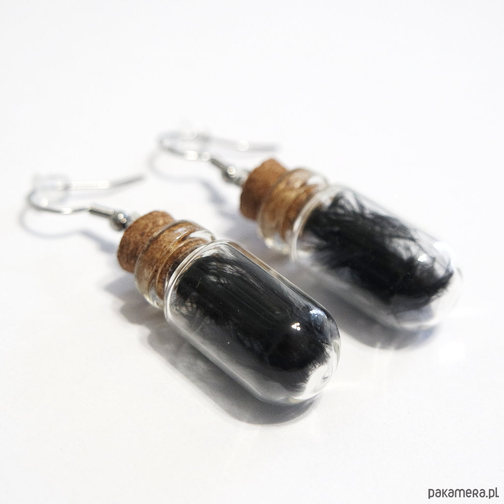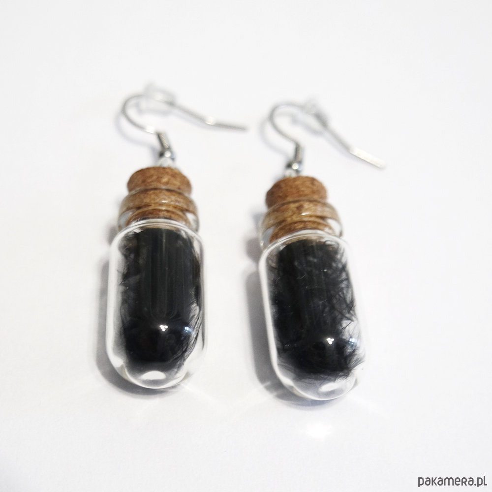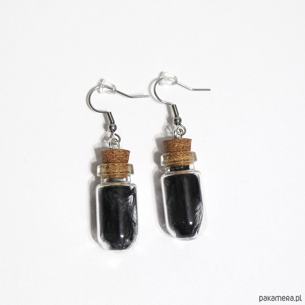 Oryginalne kolczyki z fiolkami. Fiolki zawieszone są na solidnych biglach otwartych ze stali szlachetnej i zabezpieczone silikonowymi zatyczkami.