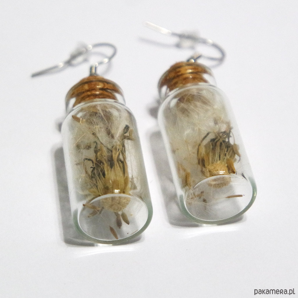 Mała, szklana fiolka, wypełniona prawdziwym dmuchawcem i zamknięta koreczkiem.