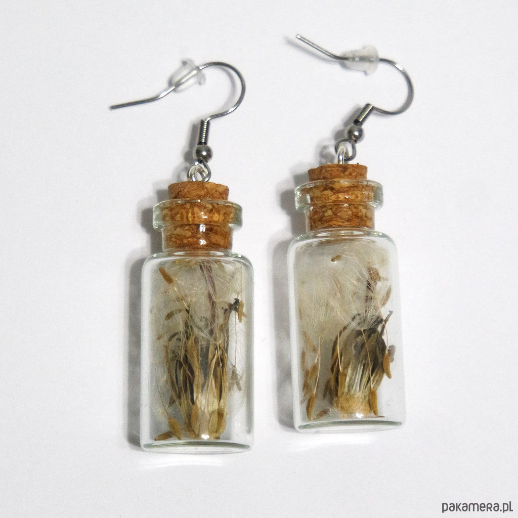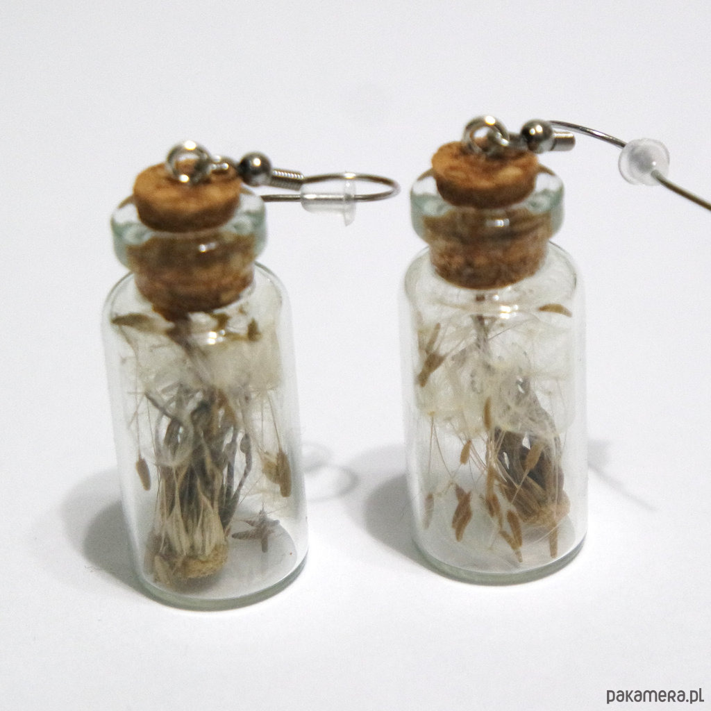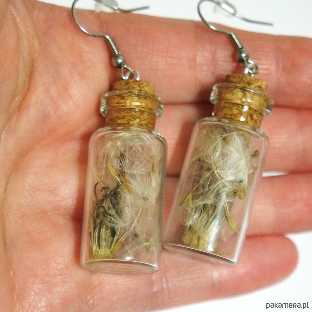 Mała, szklana fiolka, wypełniona prawdziwym dmuchawcem i zamknięta koreczkiem.
