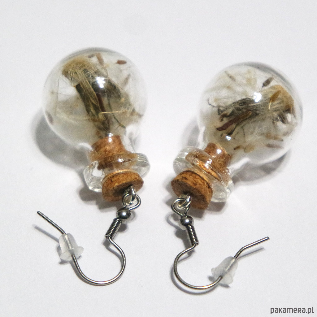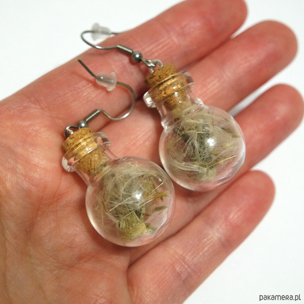 Mała, szklana fiolka, wypełniona prawdziwym dmuchawcem i zamknięta koreczkiem.