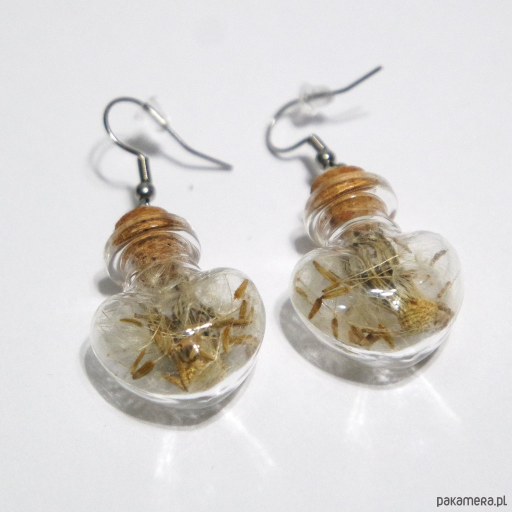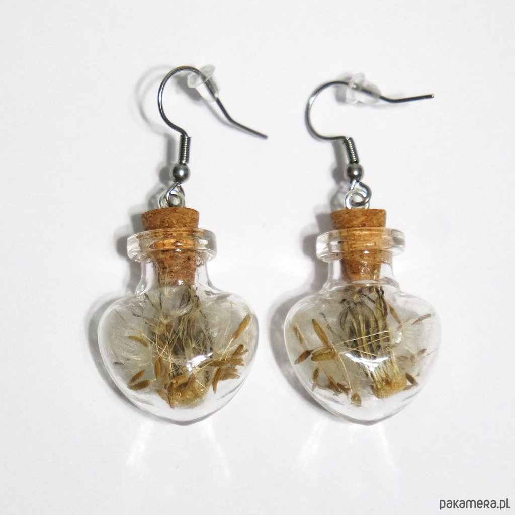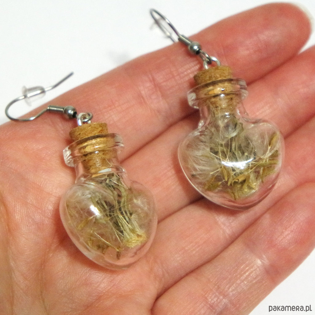 Mała, szklana fiolka, wypełniona prawdziwym dmuchawcem i zamknięta koreczkiem.