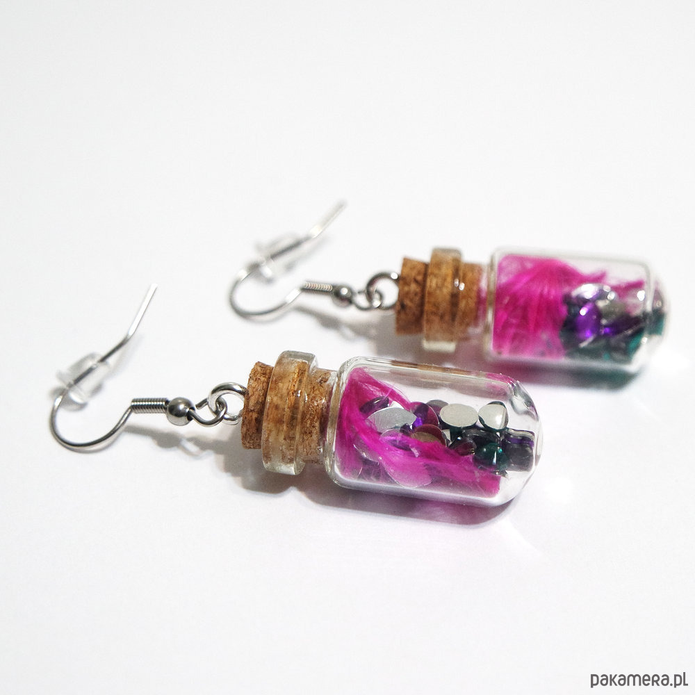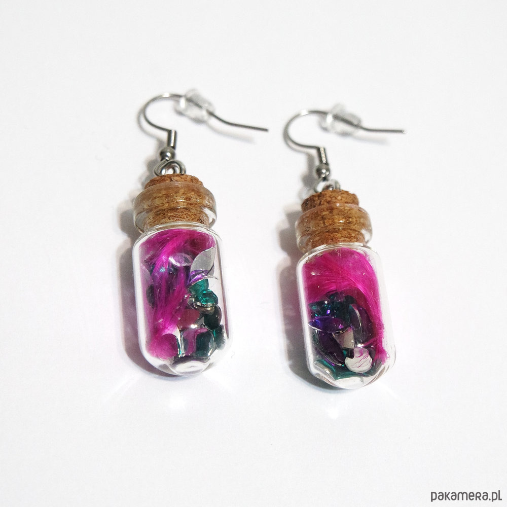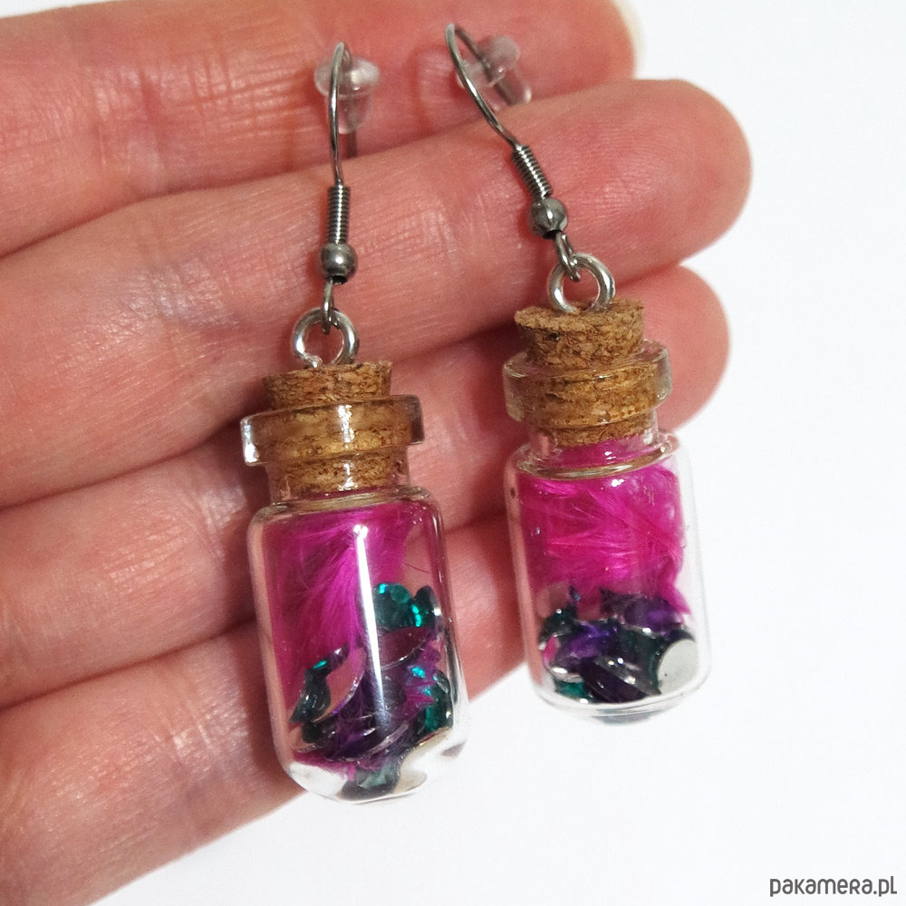 Oryginalne kolczyki z fiolkami. Fiolki zawieszone są na solidnych biglach otwartych ze stali szlachetnej i zabezpieczone silikonowymi zatyczkami.