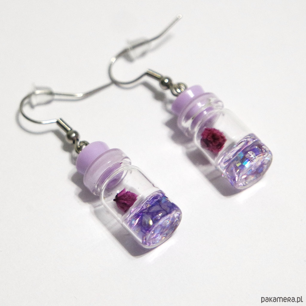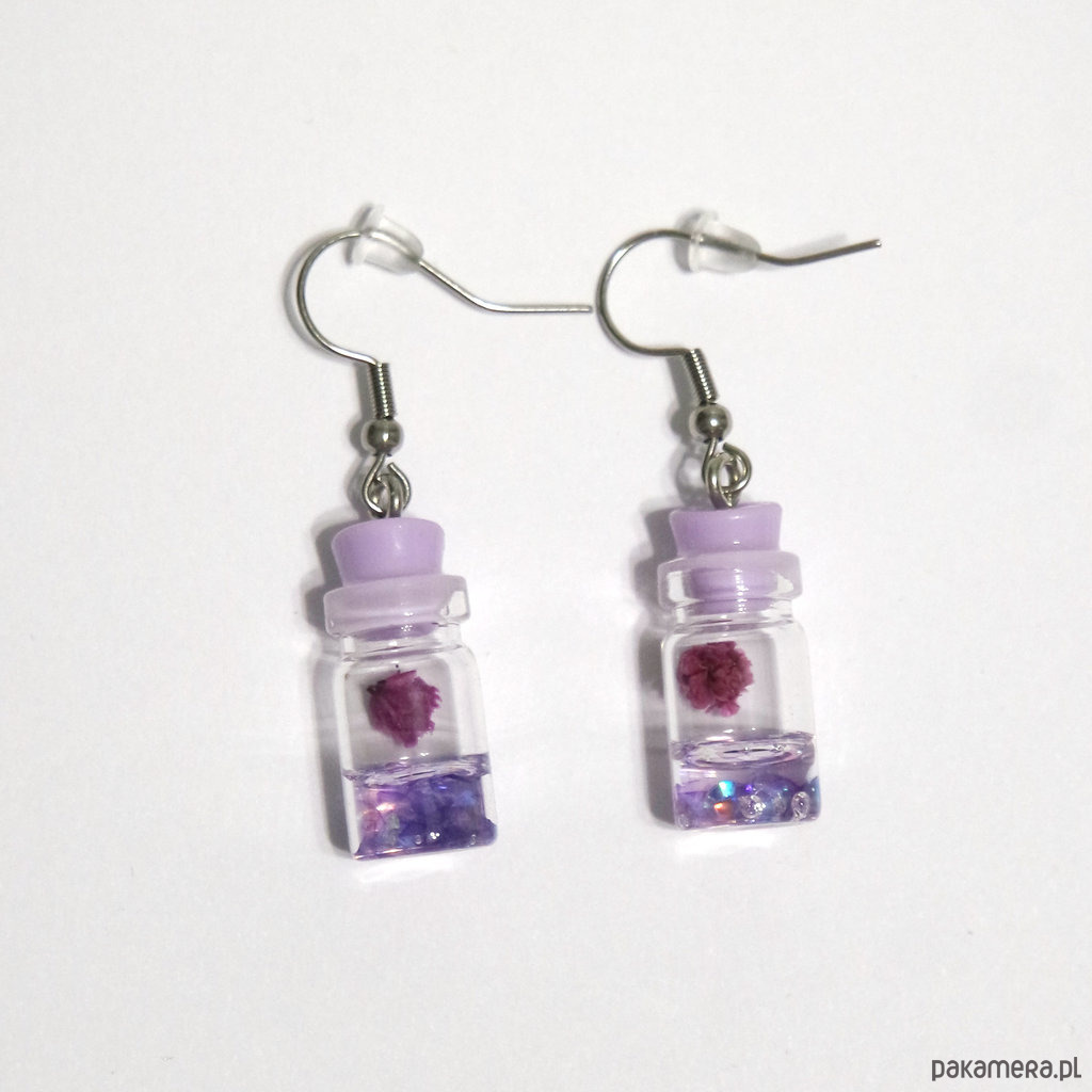 Oryginalne kolczyki z fiolkami. Fiolki zawieszone są na solidnych biglach otwartych ze stali szlachetnej i zabezpieczone silikonowymi zatyczkami.