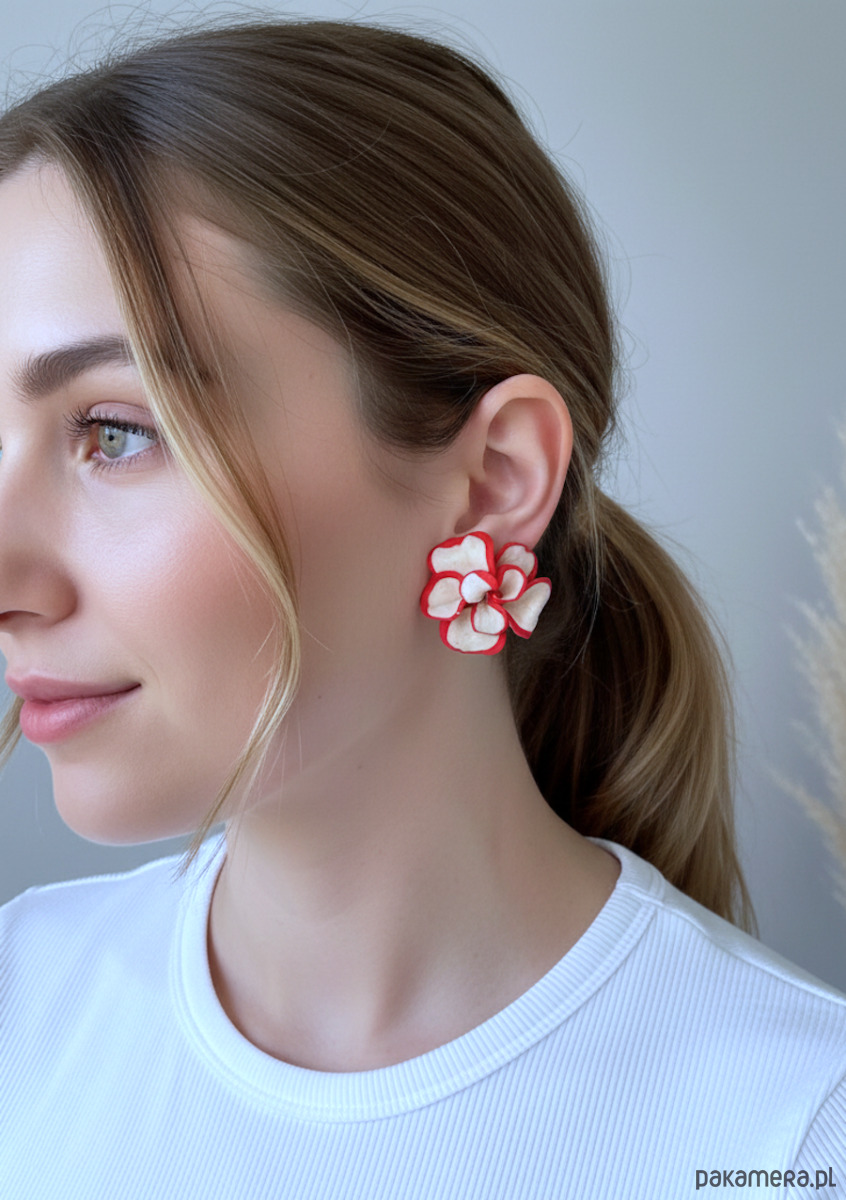 Kolczyki–kwiaty w stylu flamenco przyciągają wzrok kontrastem intensywnej czerwieni i śmietankowej bieli. Płynnie uformowane, trójwymiarowe płatki tworzą efektowną kompozycję, która pięknie otula płatek ucha i dodaje stylizacjom odważnego, kobiecego charakteru.