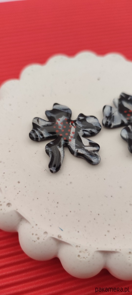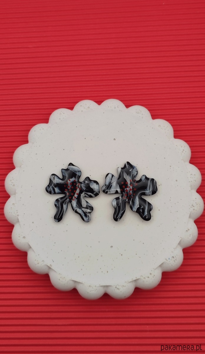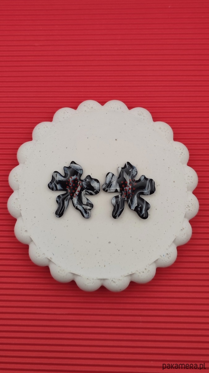 Kolczyki FLORESY - całoroczne kwiaty, marmurkowy wzór z dodatkiem czerwonym kropek.