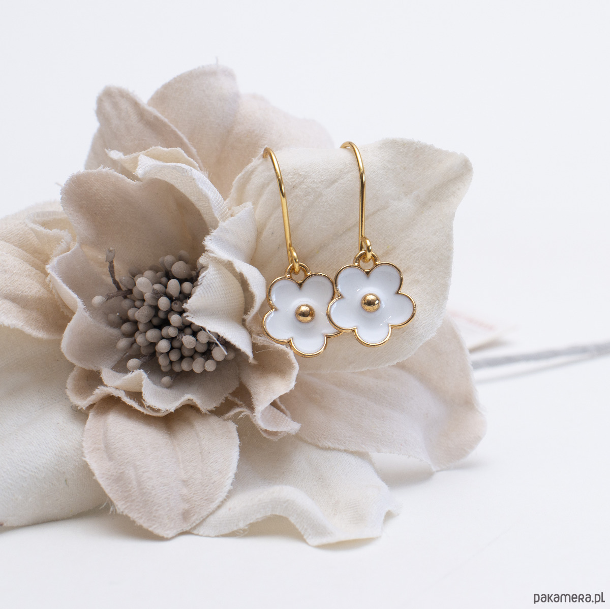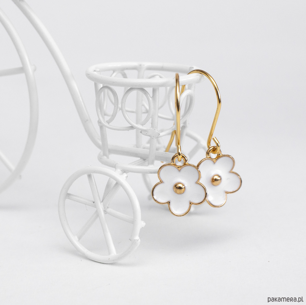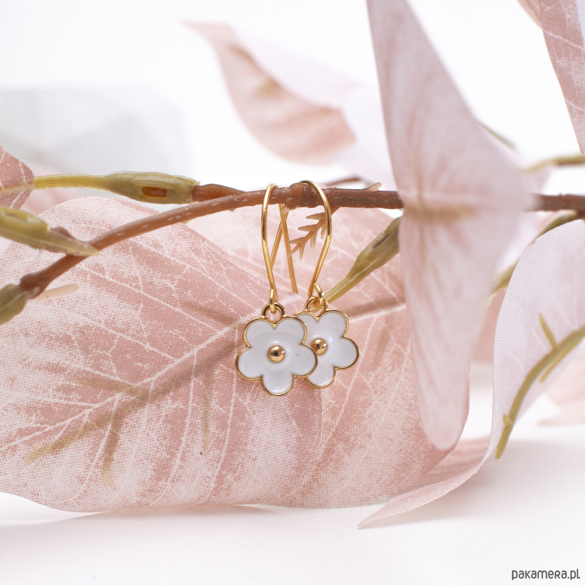 Wybierasz trwałość i urok. Kolczyki wykonane są z solidnej stali nierdzewnej, pokrytej trwałym złoceniem. Kwiatowy motyw jest precyzyjnie emaliowany na biało, co zapewnia czysty kolor i gładkie wykończenie. Hipoalergiczne bigle ze stali chirurgicznej gwarantują komfort noszenia i długotrwałą odporność na czernienie. To rzetelny zakup trwałej i uroczej biżuterii.