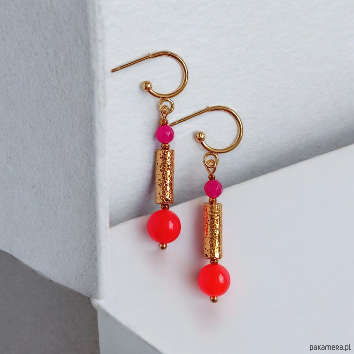 Kolczyki wykonane z jadeitu w soczystych NEONOWYCH odcieniach (8 i 4mm) oraz złotej , porowatej ławy i przekładek ze złotego hematytu.