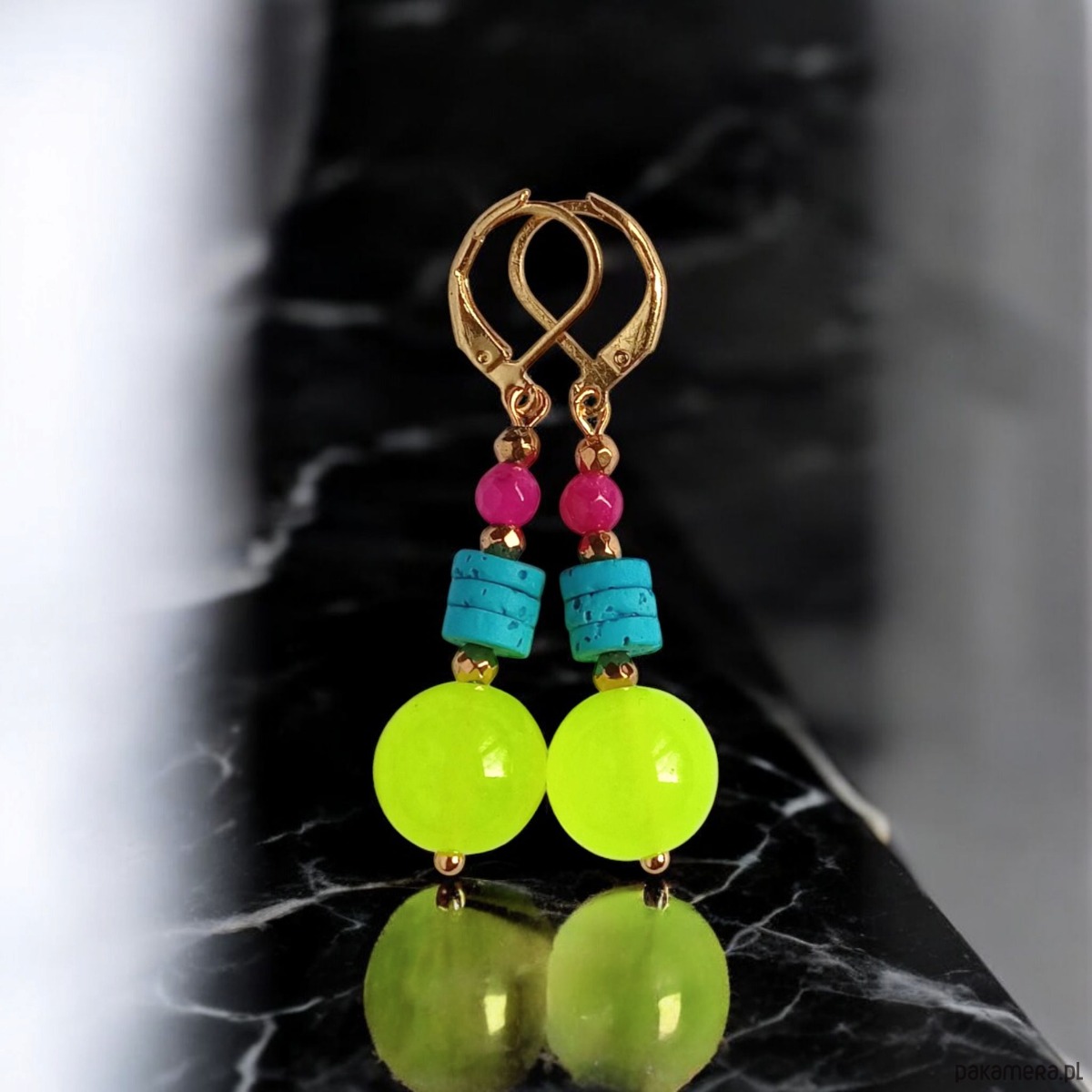 Kolczyki wykonane z jadeitu w soczystym NEONOWYM odcieniu (12mm! ) oraz jadeitu 4mm i turkusowej lawy wulkanicznej oraz przekładek ze złotego hematytu.