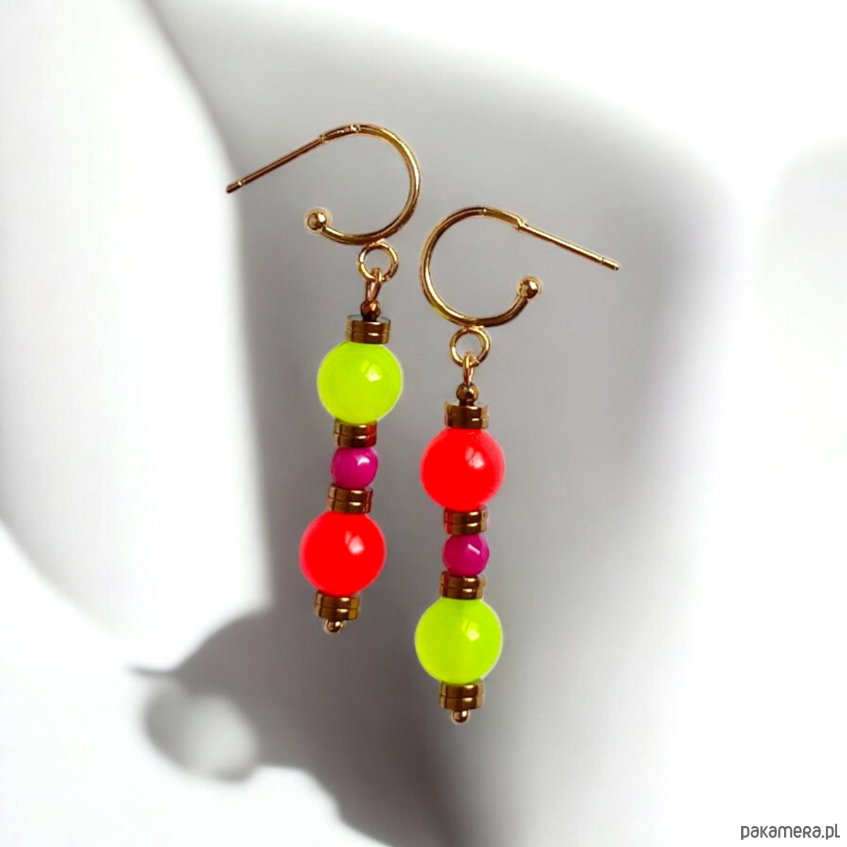 Kolczyki wykonane z jadeitu w soczystych NEONOWYCH odcieniach (8 i 4mm) oraz przekładek ze złotego hematytu.