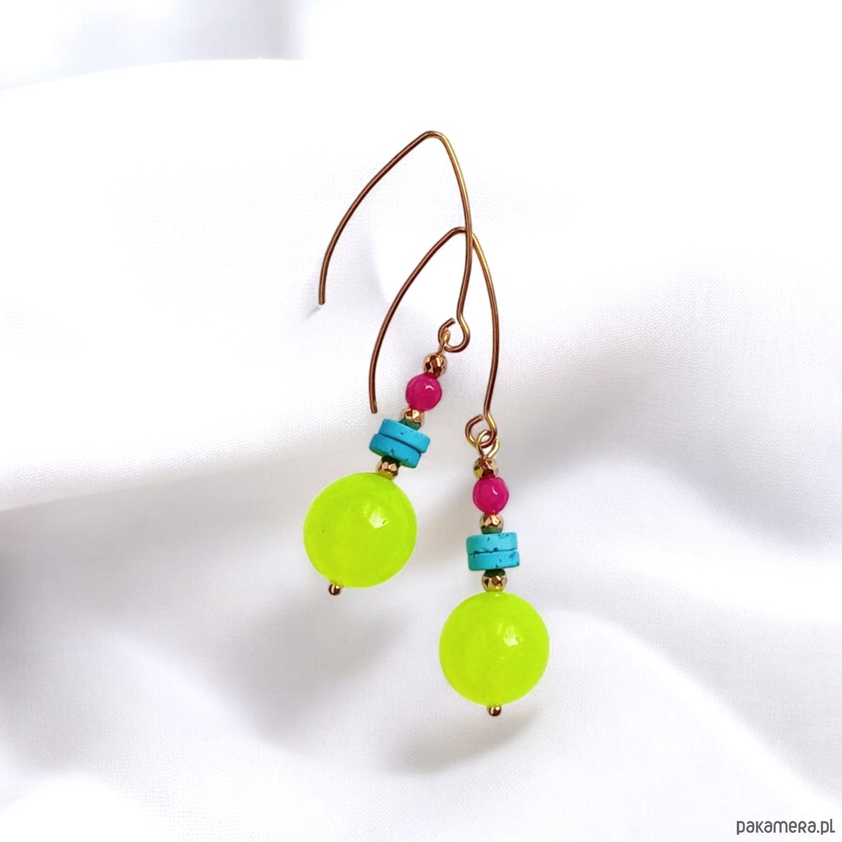 Kolczyki wykonane z jadeitu w soczystym NEONOWYM odcieniu (aż 14mm! ) oraz jadeitu 4mm i turkusowej lawy wulkanicznej oraz przekładek ze złotego hematytu.