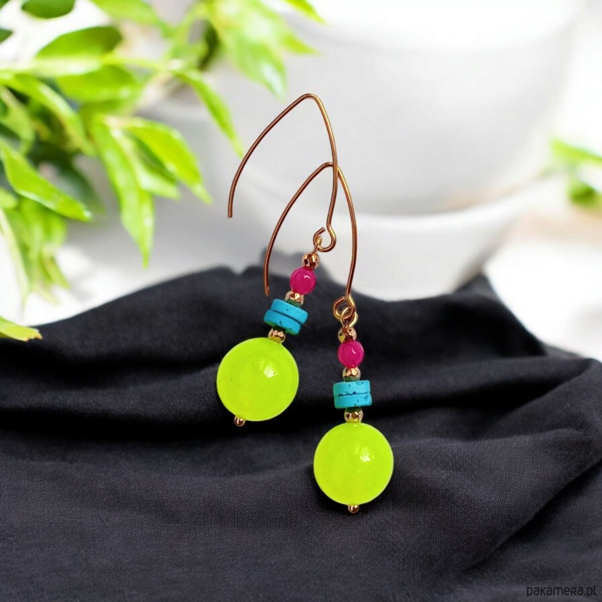 Kolczyki wykonane z jadeitu w soczystym NEONOWYM odcieniu (aż 14mm! ) oraz jadeitu 4mm i turkusowej lawy wulkanicznej oraz przekładek ze złotego hematytu.