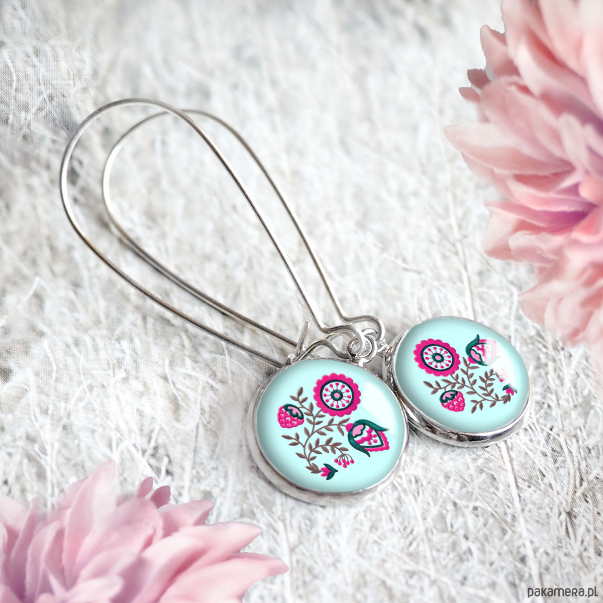 Delikatne, śliczne kolczyki wiszące z oryginalną grafiką artystyczną, umieszczoną pod wypukłym szkłem, w oprawie ze stali chirurgicznej. Grafika jest najwyższej jakości. Bigle duże, zapinane, posrebrzane. Szkła z grafiką są niepowtarzalne, wykonane ręcznie według mojego projektu, z dbałością o każdy detal, dlatego biżuteria ta jest jedyna w swoim rodzaju i niespotykana.