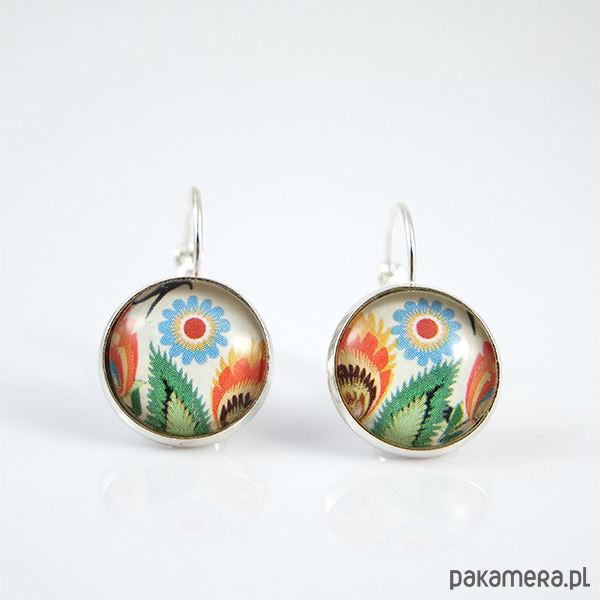 Grafika ukryta w prostych, eterycznych kolczykach, pod osłoną przeźroczystego półokrągłego szkiełka.