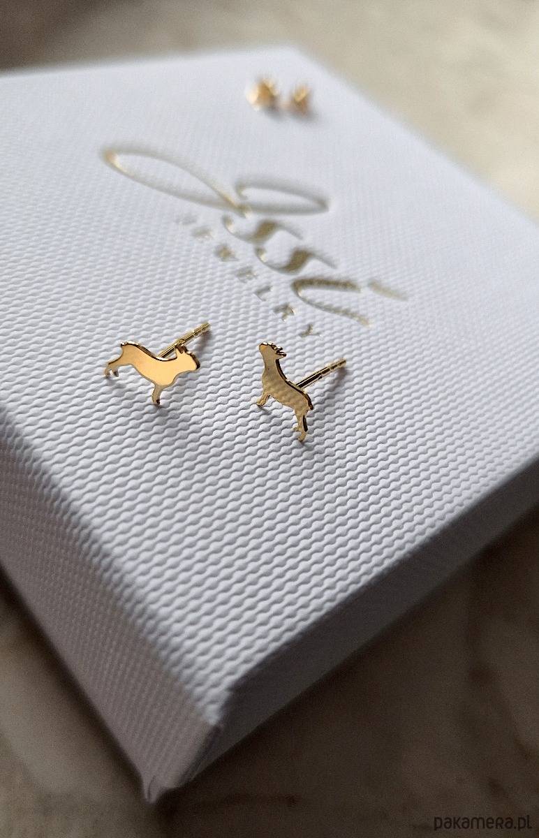 Drobne kolczyki zapinane na sztyfty, w kształcie buldogów francuskich.